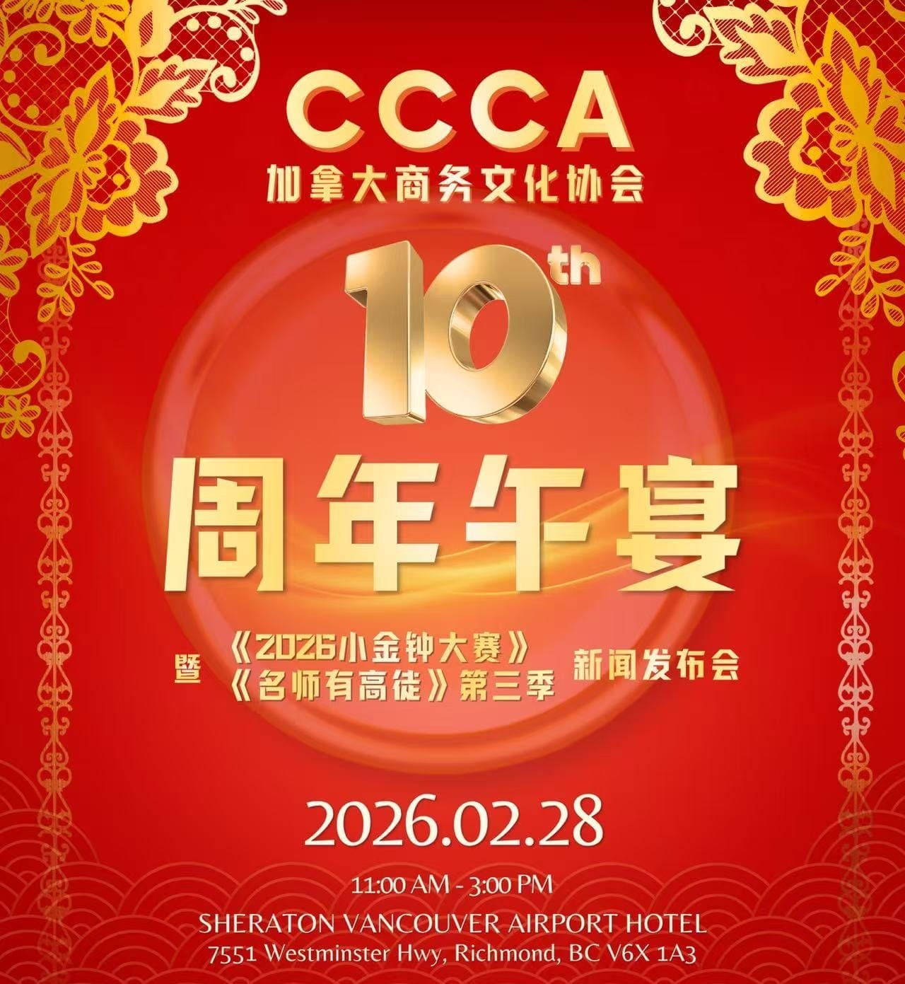 【加拿大高度传媒艾琳报道 Mike Ye摄影】 早春二月,群贤毕至。加拿大商务文化协会(CCCA)于2月28日在温哥华机场喜来登酒店隆重举办成立十周年庆典午宴,并同步举行《2026小金钟大赛》及《名师有高徒》第三季新闻发布会。