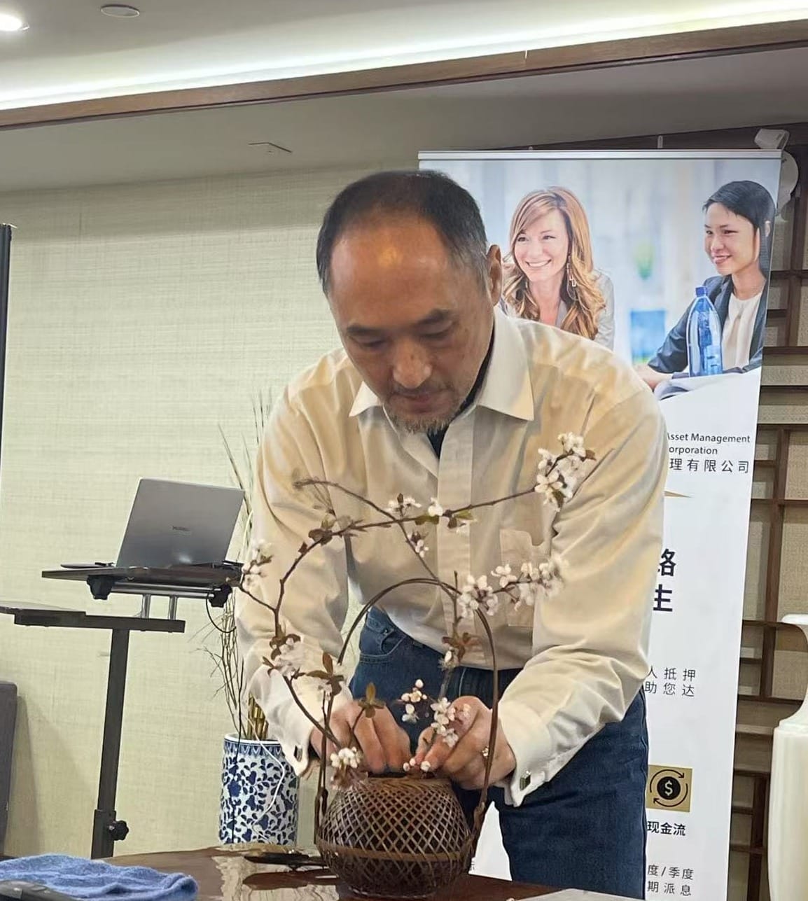 本期讲座下半场,特邀国际时尚盛典创办人兼执行制片人茶道花道疗愈导师David陈老师,给大家展示 插花艺术造型过程,将剪切下来的植物枝、叶、花、果作为创作素材,经过修剪、整枝、弯曲等技术处理和意境思考、构图造型、色彩搭配等艺术加工,重新配置形体而成,富有诗情画意,能展现大自然美和生活美,使花、人成为一体,达到纯静的程度。