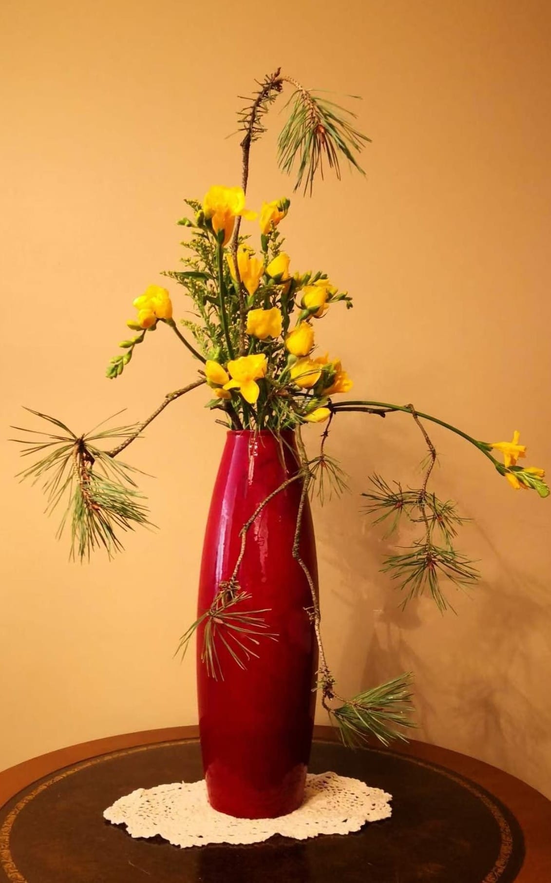 然后,陈老师讲,这一 插花过程是一种很好的修身养性之道,对人的身心健康有很大好处,它可以提高你的修养,美化你的心灵,使你对生活充满希望和信心。同时,作品可以装扮你的环境,使你每天赏心悦目、开心快乐,陶冶情操。