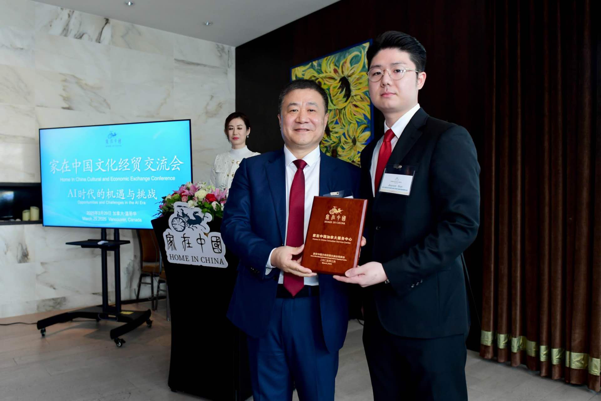 首先举行授牌仪式:由刘奇主席向家在中国文化经贸交流会组委会秘书处海外专员Jayson Sun先生颁发【家在中国加拿大服务中心】荣誉牌。