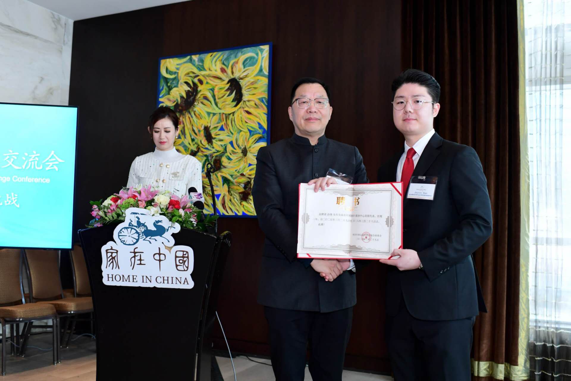 接着举行授证仪式:由华联会牛华会长向Jayson Sun先生颁发【家在中国加拿大服务中心首席代表】聘书。