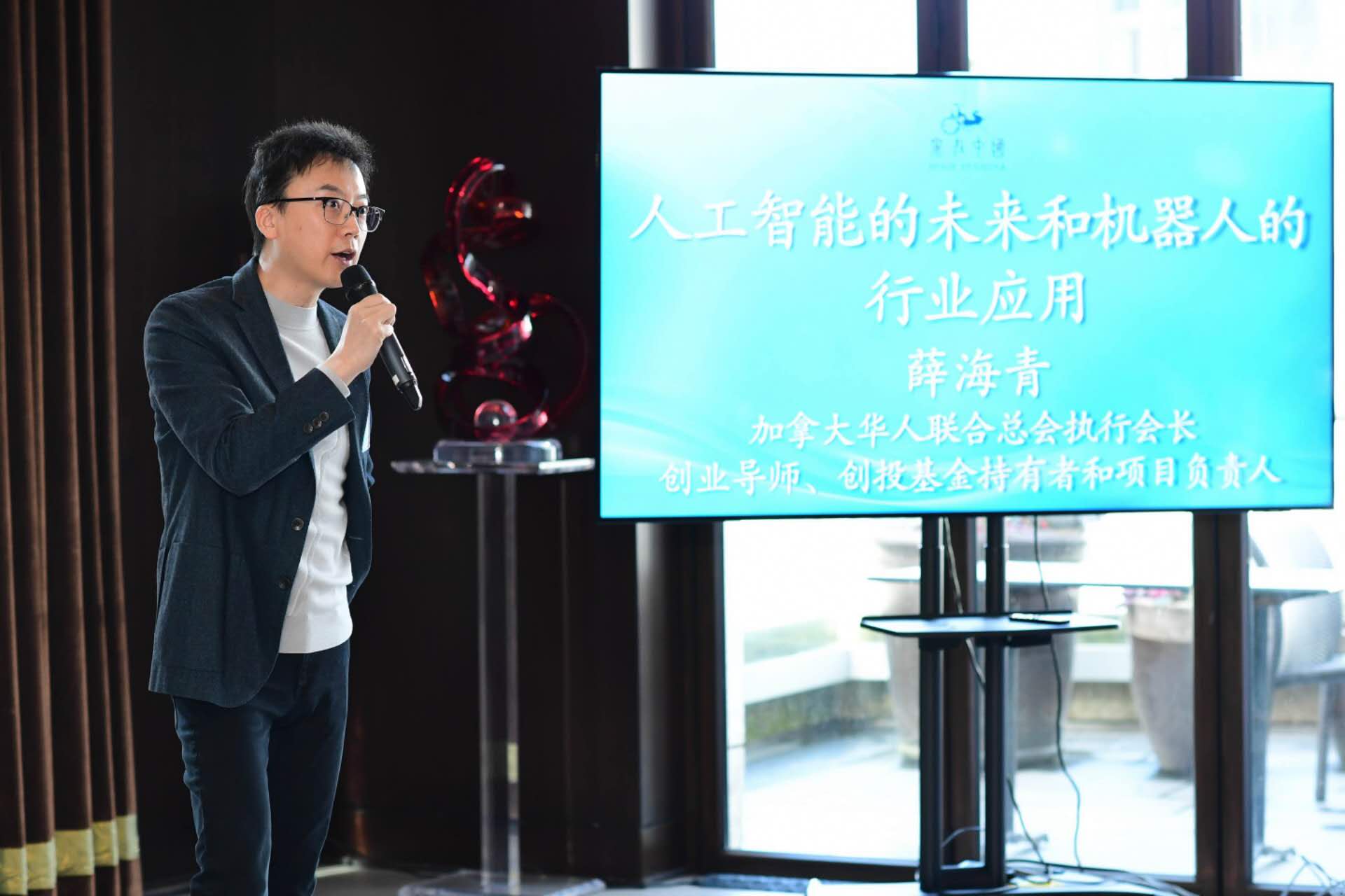加拿大华人联合总会执行会长薛海青先生随后上台,以《人工智能的未来和机器人的行业应用》为主题,结合自己创新AI售货机的成功经历,介绍了AI如何改变了传统服务业的营销模式。