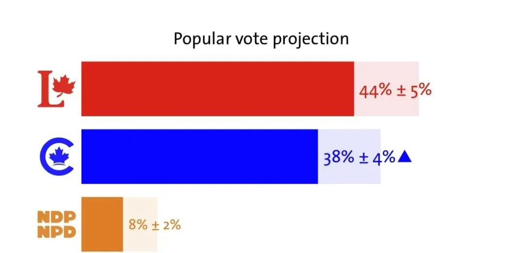 【加拿大高度传媒网站 转载 高度见闻 温存一刀04月08日 文章】果不其然,由于美国总统特朗普对当下的加拿大已构成现实最大威胁,因此从另一方面来说,当抗美凝聚成全体加国民众的共识后,现任总理,联邦自由党领袖卡尼(Mark Carney) 的选情则是继续攀升。据最新338 Canada 民调显示,自由党支持率已升至44%,领先保守党38% 超过六个百分点,而新民主党只有8%,如果换算成席位,自由党有望赢得200席,保守党则是120席,而新民主党只剩下3席。