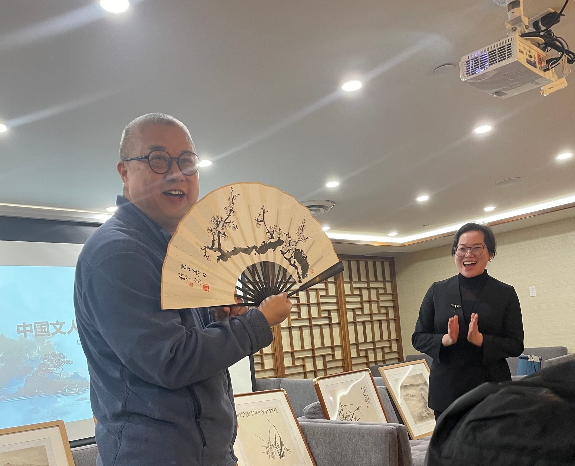 借此机会,大家也要感谢辛苦备课《道德经》并从北京亲自背回人手一册的教材杨金宝老师(左)、为大家多次演奏与讲解古琴及书画艺术的高建国老师(中)、及教授大家如何学会通过时尚插花,提升个人艺术修养的David老师(右)。