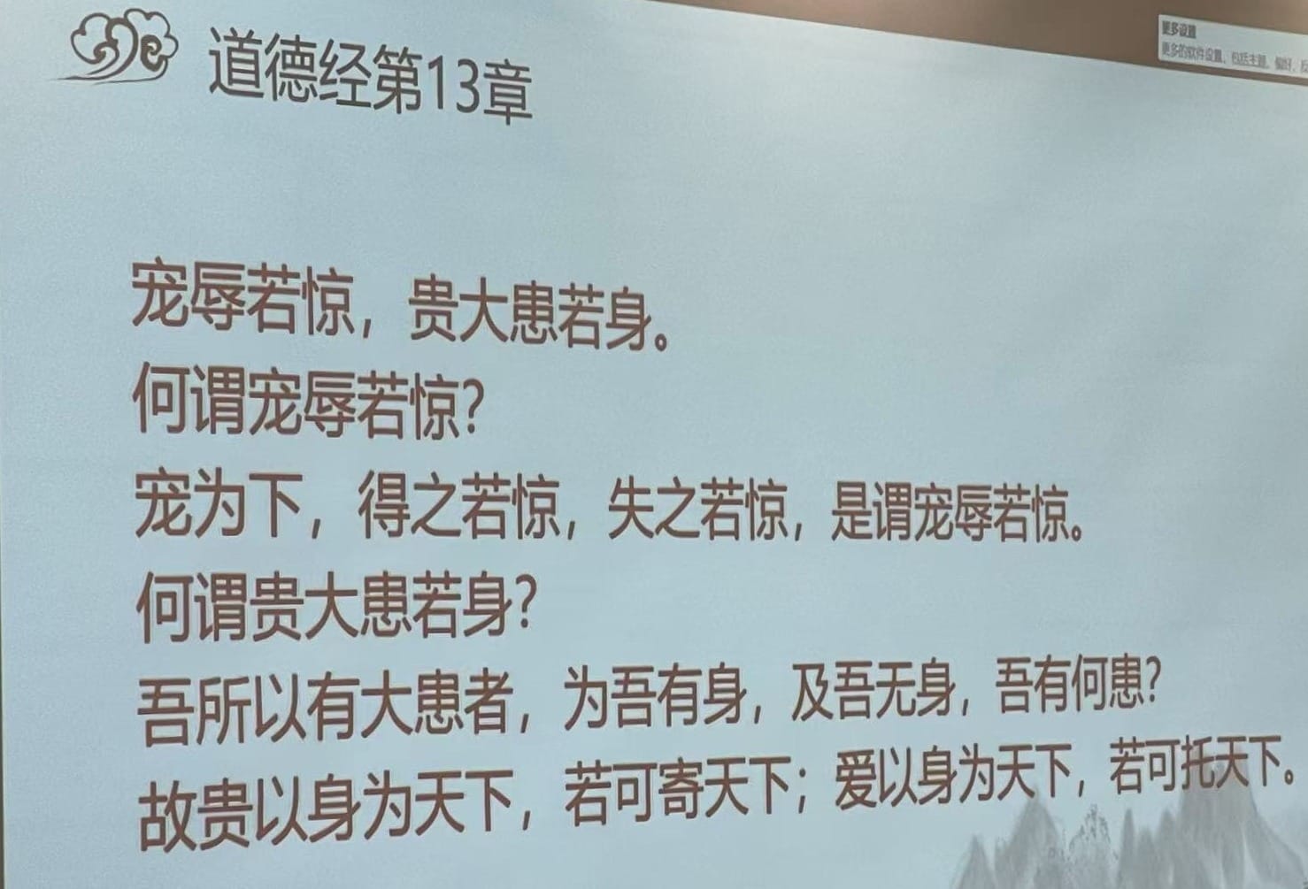 本章主要讨论两个问题:一是“宠辱若惊”,一是“贵大患若身”。这两句是在《道德经》里经典的语录中,老子对宠辱有独到的见解。