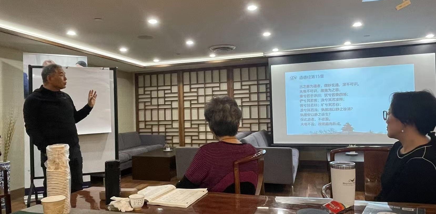 高燕子女士主持了今天的讲座,她说:在本期讲座中,我们再度回归《道德经》,继续追寻道家的幽微哲思,领悟人如何在纷繁世界中守住内在的宁静与觉醒。杨金宝老师将带领我们领略《道德经》第十四和十五章的深邃智慧, 以“执古御今,微妙玄通”为主题,思考在这个瞬息万变、喧嚣浮躁的时代里,老子的“古之道”如何能帮助我们更好地把握现在、引领未来“微妙玄通”的处世之道,又如何在我们的家庭、事业、人际关系中落地生根?