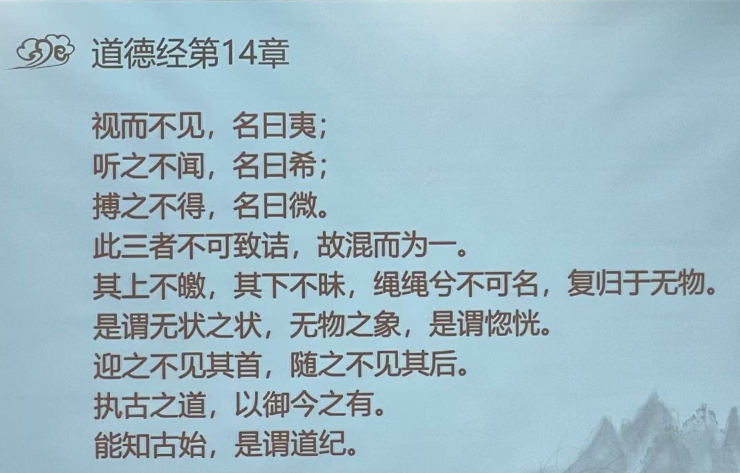 白话译文:看它看不见,把它叫做夷;听它听不到,把它叫做希;摸它摸不到,把它叫做微。它的上面既不显得光明亮堂;它的下面也不显得阴暗晦涩,无头无绪、延绵不绝却又不可称名,一切运动都又回复到无形无象的状态。这就是没有形状的形状,不见物体的形象,这就是惚恍。迎着它,看不见它的前头,跟着它,也看不见它的后头。能认识、了解宇宙的初始,这就叫做认识道的规律。
