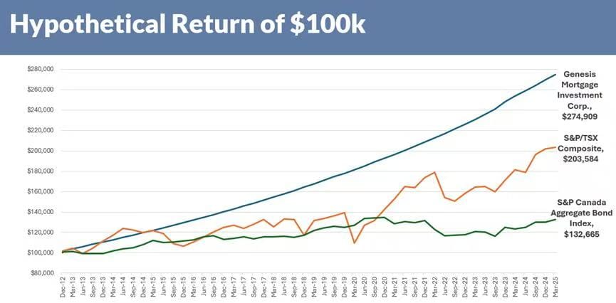 作为加拿大房地产抵押贷款投资领域的先行者,景泰资本(Gentai Capital)已经稳健运营近13年,累计管理资产达4.35亿加元,始终致力于为投资者提供高质量、低波动的回报。我们的旗舰基金——景泰房屋抵押贷款投资基金(GMIC),自成立以来,年化回报率保持在8.24%-9.5%之间,累计分红超过1亿加元。如果您在基金成立初期投入$100,000,截至2025年3月31日,这笔投资已经增长至$274,909,展现了复利和稳定收益的强大力量。
