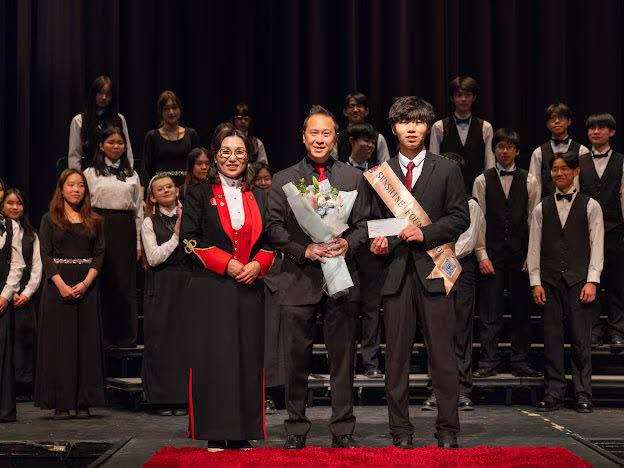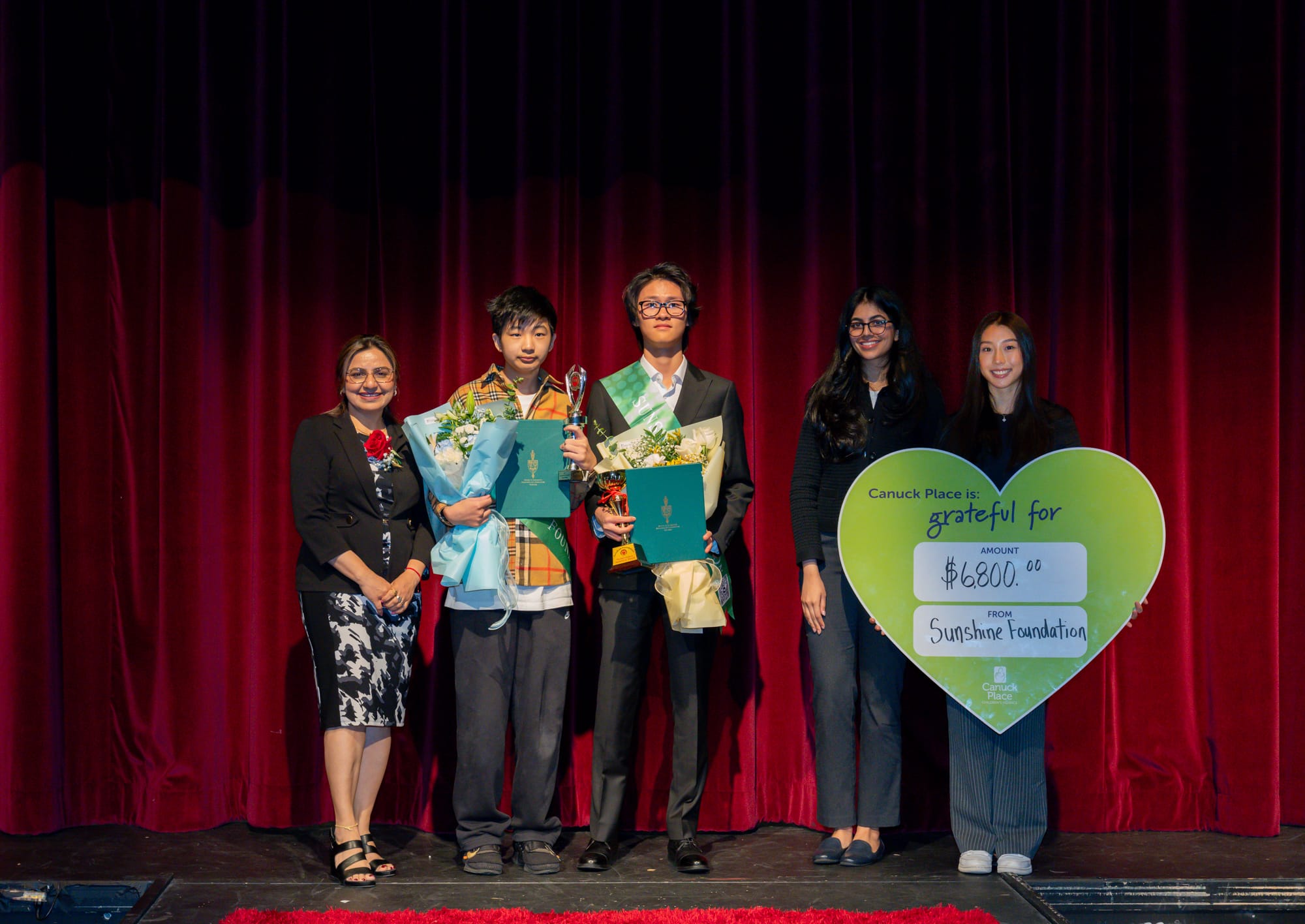 接着,阳光基金会举行了向Magee中学合唱团捐赠2000加元的仪式,由2025-2026年度阳光基金会新任主席Shawn Zhao与家长委员主席Linda Xu共同交付,并向合唱团的全体成员颁发了爱心义工表演奖证书。作为温哥华最有影响力的青少年音乐社团之一,Magee合唱团为本次典礼提供了高水平的音乐演出,展现了青年艺术与公益的深度融合。这一捐赠更深化了学校、社区与青少年公益组织之间的合作关系。