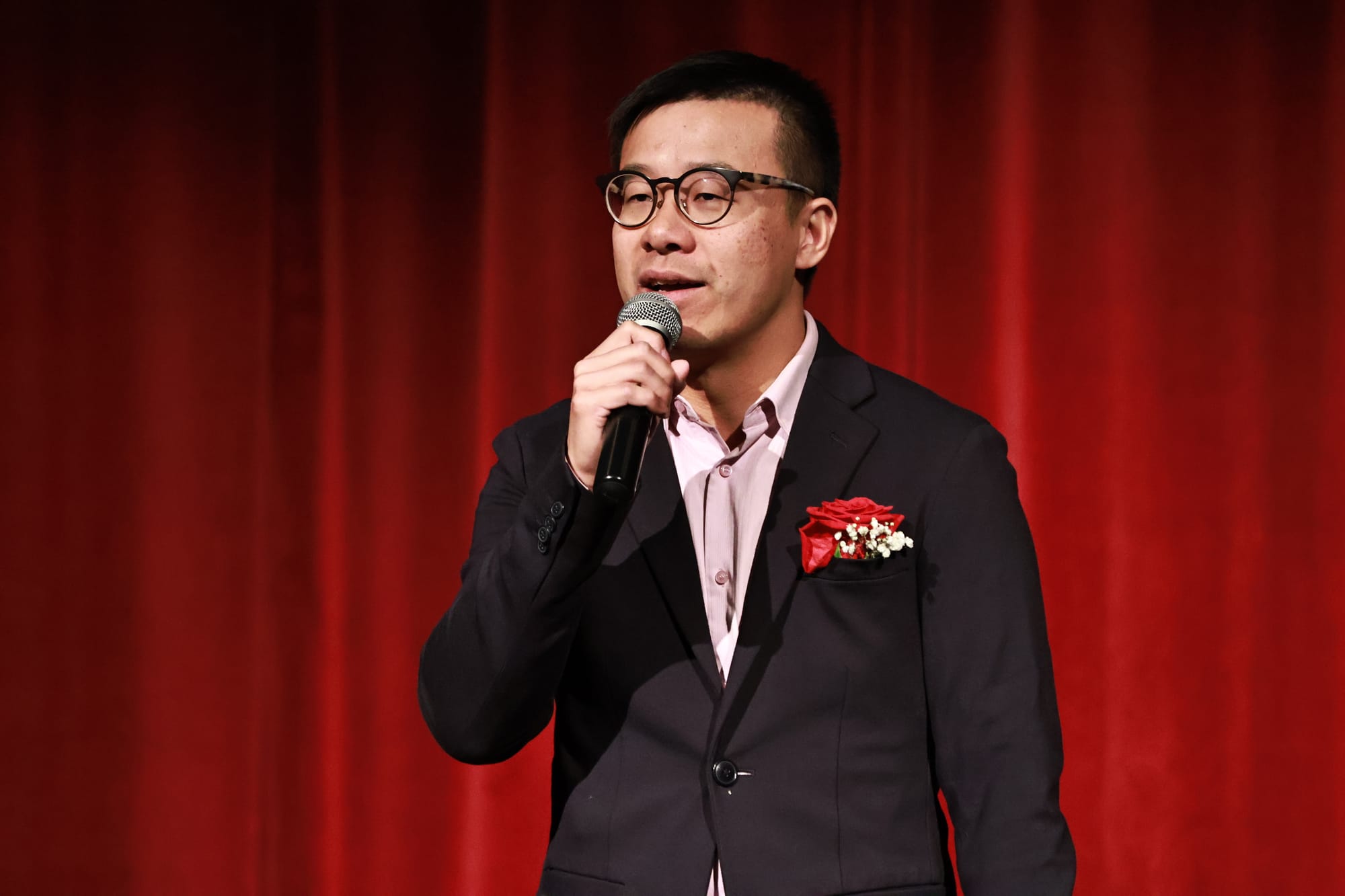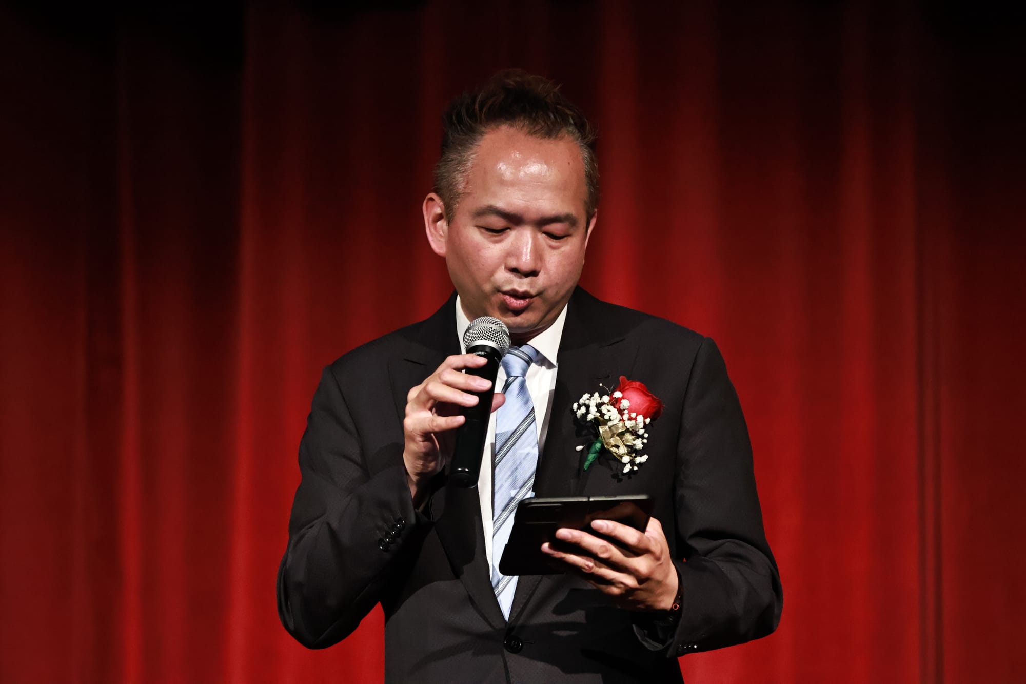 温哥华教育局学务委员Alfred Chien上台致辞, 向所有今年的获奖者表示诚挚的祝贺!