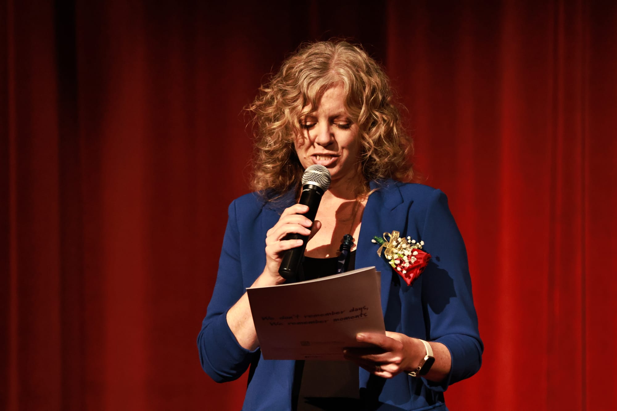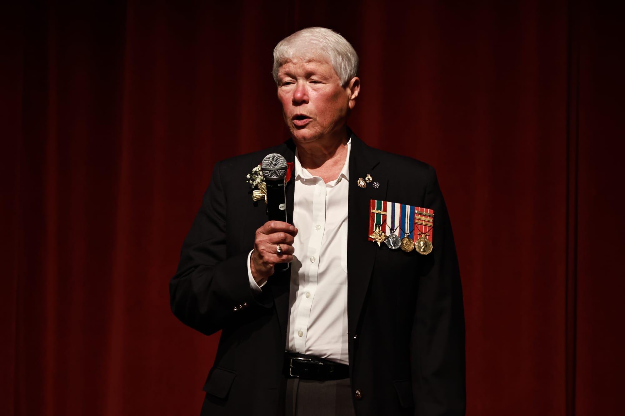 加拿大12军需营前指挥官、退役中校Beth Brown上台致辞, 向所有今年的获奖者表示诚挚的祝贺!