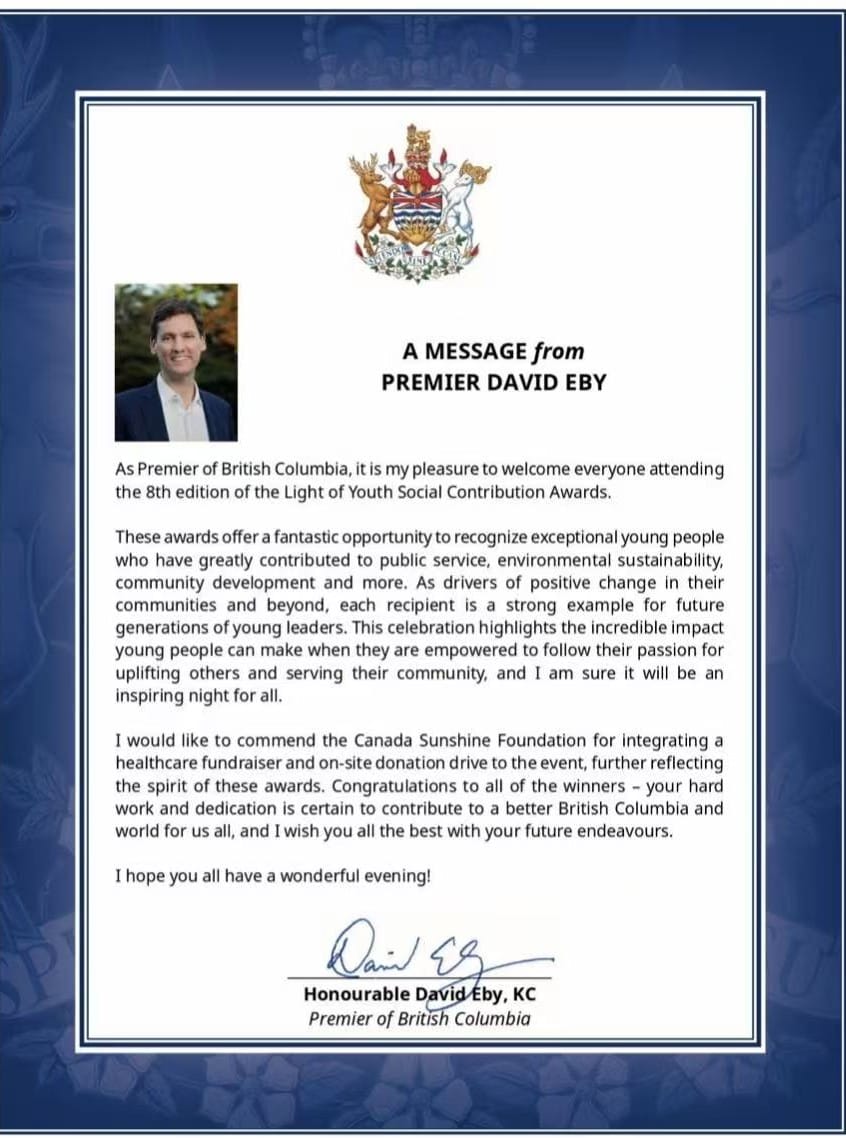 [高度传媒首席记者 王子游现场报道] 2025年6月,加拿大阳光基金会在温哥华Magee Secondary School500人剧场隆重举办第八届青年之光颁奖典礼,表彰在过去一年中在社区服务、公益贡献、青年领导力等方面表现突出的优秀青年志愿者。来自政界、教育界、商界和公益领域的嘉宾齐聚一堂,共同见证青年成长与公益精神的传承。