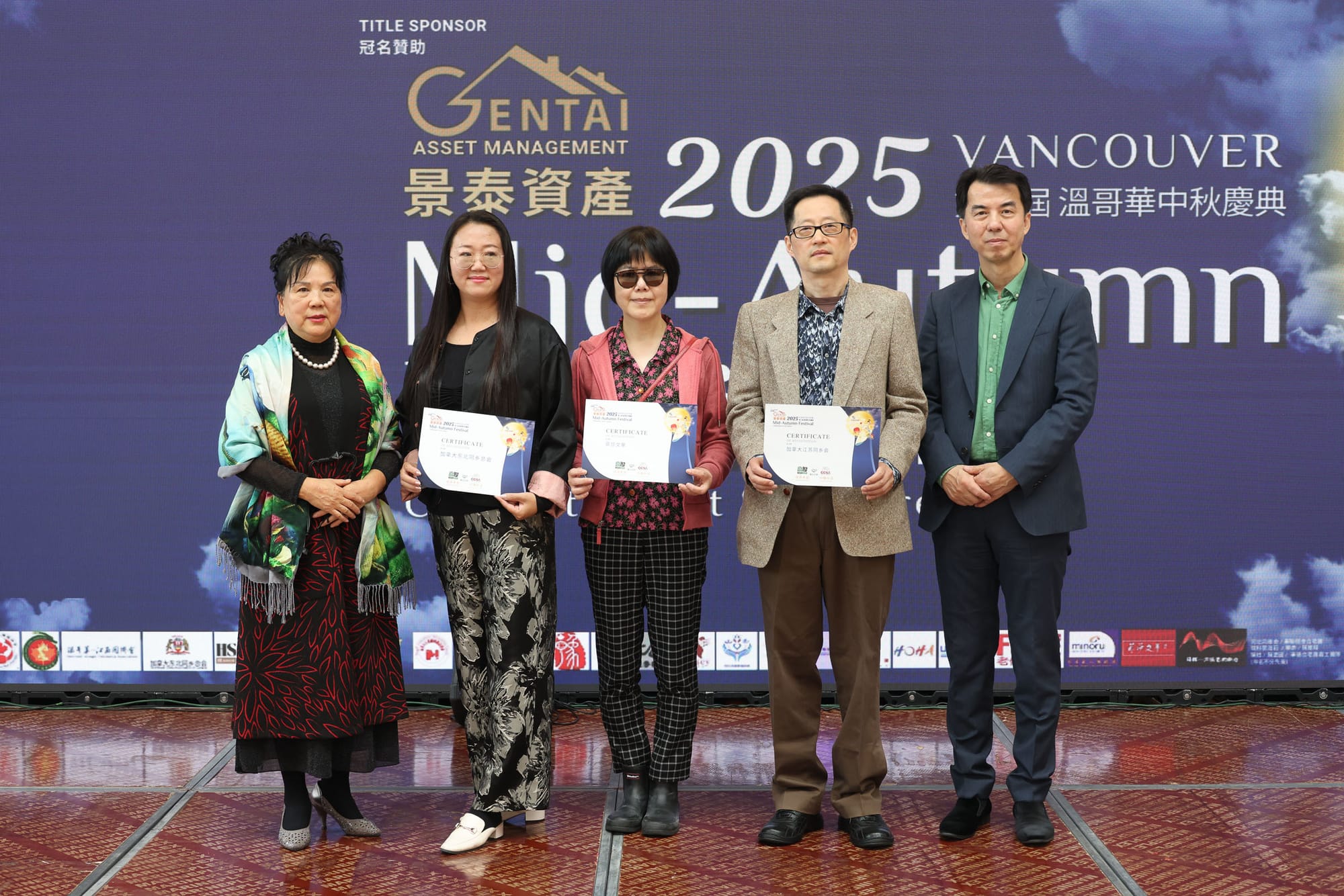 主办方颁发感谢状,分别是冠名赞助:景泰资产 Gentai Asset Management;至尊赞助:Tsawwassen Mills ;钻石赞助:富渔国际 Frobisher International Enterprise Ltd. ;金赞助:赢传媒活动设备租赁公司Win&Win Media Ltd ;银赞助:饭团外卖 Fantuan Delivery以及青铜赞助:华生国际有限公司 Watson Enterprises Inc