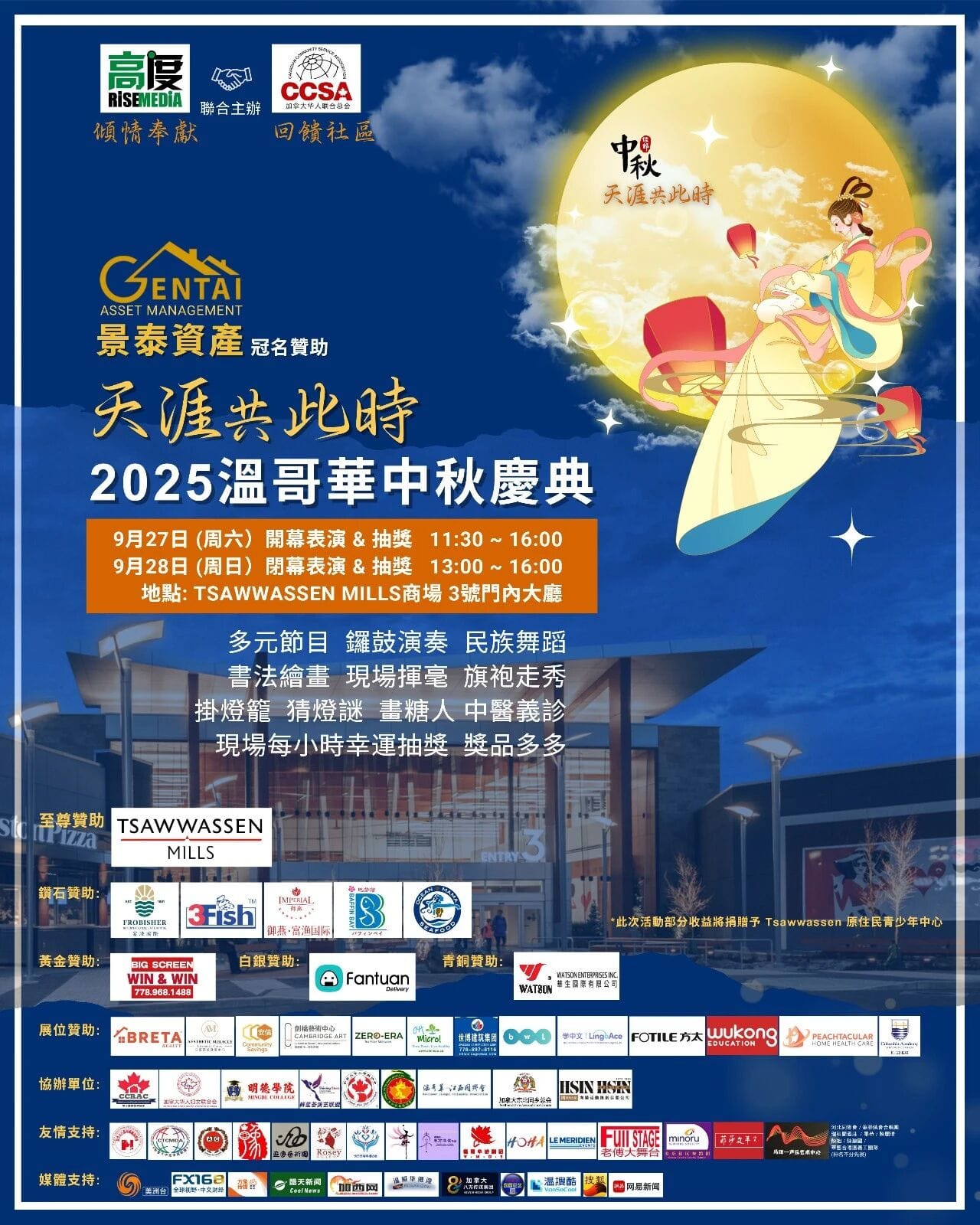 9月27至28两日,由景泰资产冠名,高度传媒与加拿大华人联合总会共同主办的「天涯共此时2025温哥华中秋庆典」活动,在 Tsawwassen Mills 购物中心盛大举行。