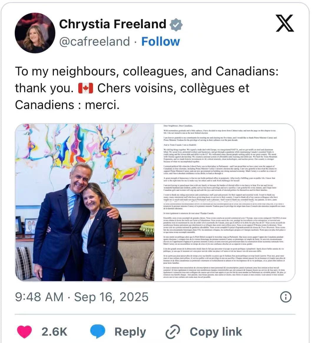 与此同时,卡尼还在秋季国会痛失一位战友,那就是特鲁多时代的副总理,现任联邦交通和国内贸易部长方慧兰宣布辞职并离开内阁,未来将接任加拿大乌克兰重建事务特别代表。
