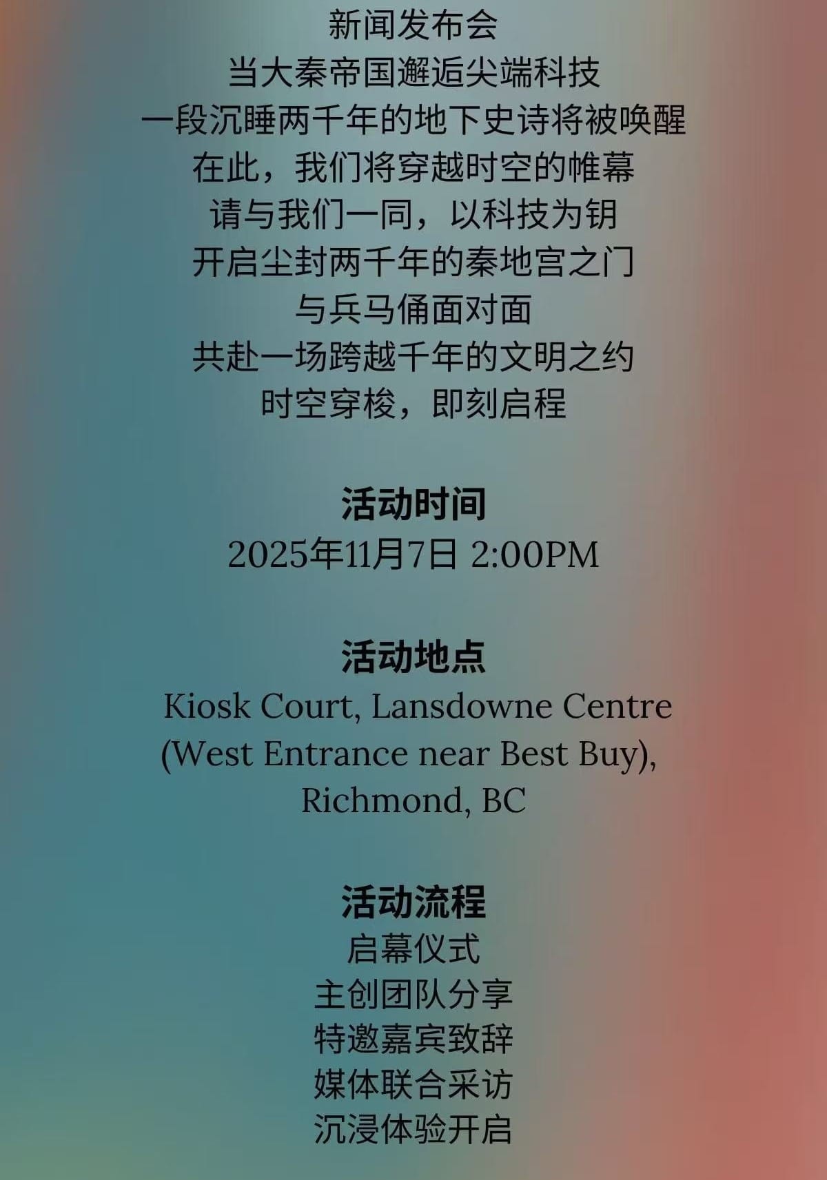 由加拿大Broadway Magic Wonders Inc. (BMW) 战略引进,西安宏文数字科技有限公司出品,陕西文化产业投资控股(集团)有限公司、HTC集团联合制片,共同打造的XR大空间沉浸式体验项目《帝国密码·秦始皇陵》,将于 2025年11月29日 在 列治文 Lansdowne Centre 盛大开幕。届时,观众将置身秦陵地宫的恢宏阵列,穿越时空,亲历“世界第八大奇迹”的壮丽重生。