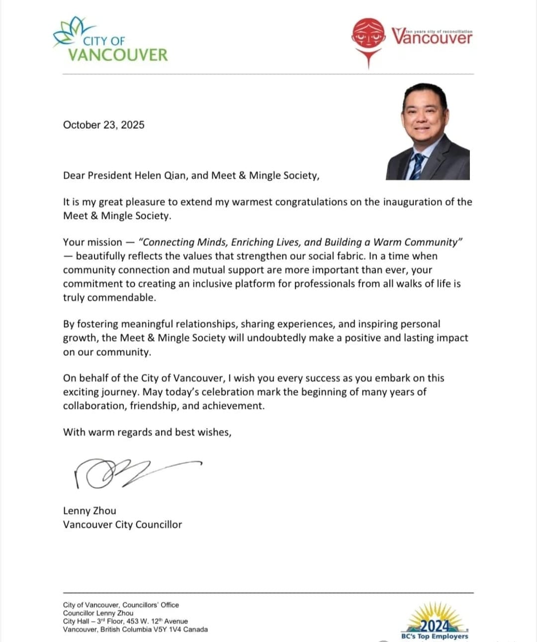 及温哥华市议员Lenny Zhou周楠先生,他们都高度肯定了协会的成立在促进社群互动、推动区繁荣方面的积极意义。