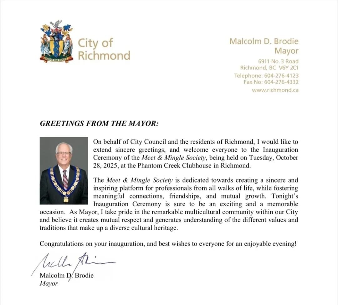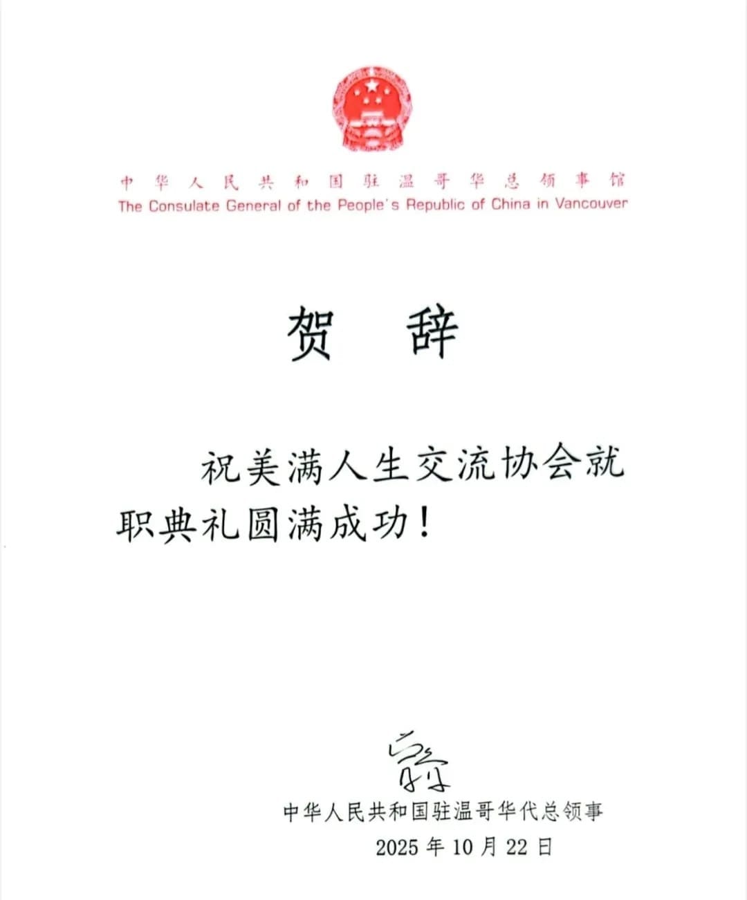 活动还收获了来自多位政要发来的贺信,他们是:中华人民共和国驻温哥华总领馆代总领事曾智先生