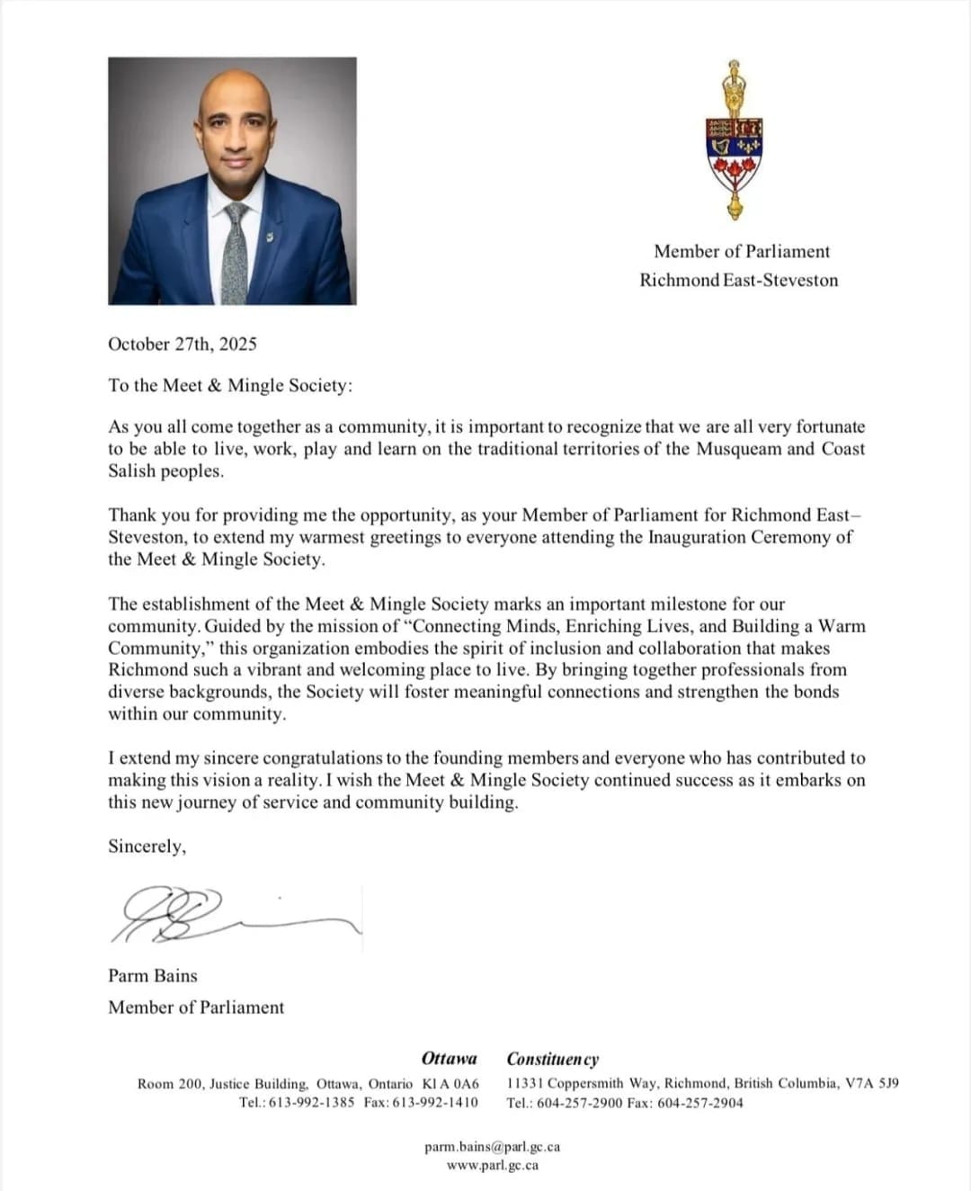 加拿大国会议员Parm Bains白恩斯先生