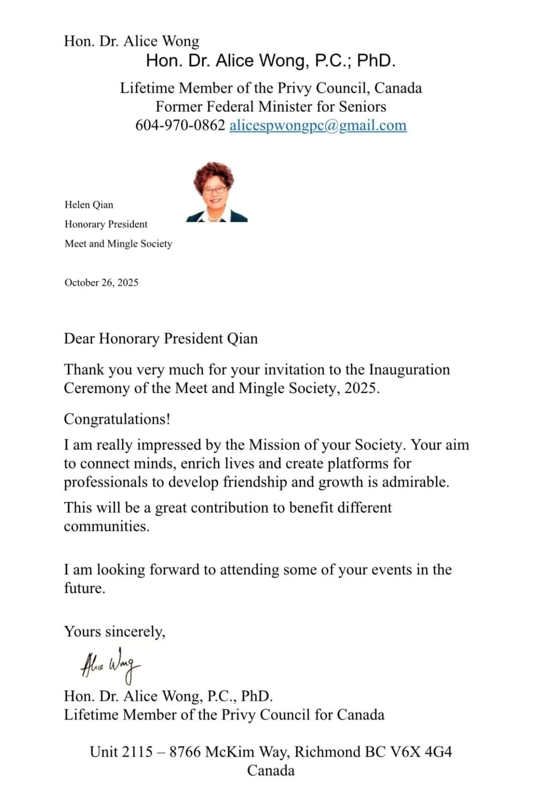 加拿大枢密院院士Dr. Alice Wong黄陈小萍女士