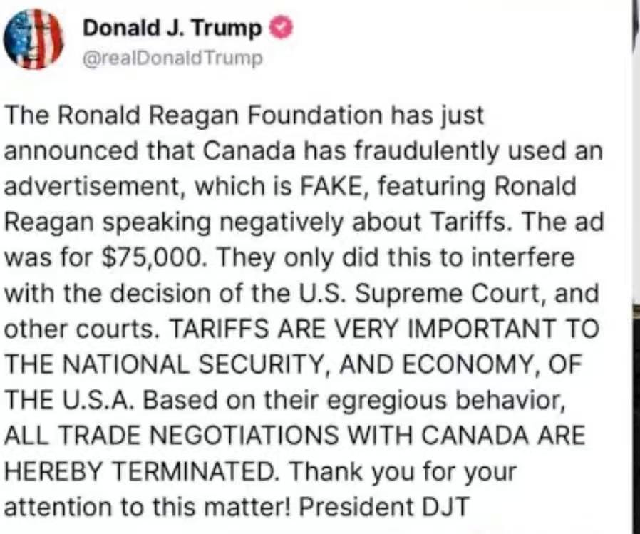 原计划加拿大和美国定于本月月底正式达成新版贸易协定,但现在却以彻底决裂的方式黯然收场。综合多家英文媒体报道,美国总统特朗普早先通过个人社交媒体表示,由于保守派智库罗纳德·里根基金会公布了加拿大欺诈性地使用了一则虚假广告对关税发表了负面言论,而这则广告价值7.5万美元,加拿大这样做已经干扰了美国最高法院和其他法院的裁决。