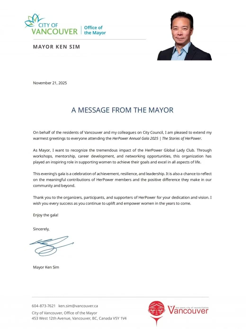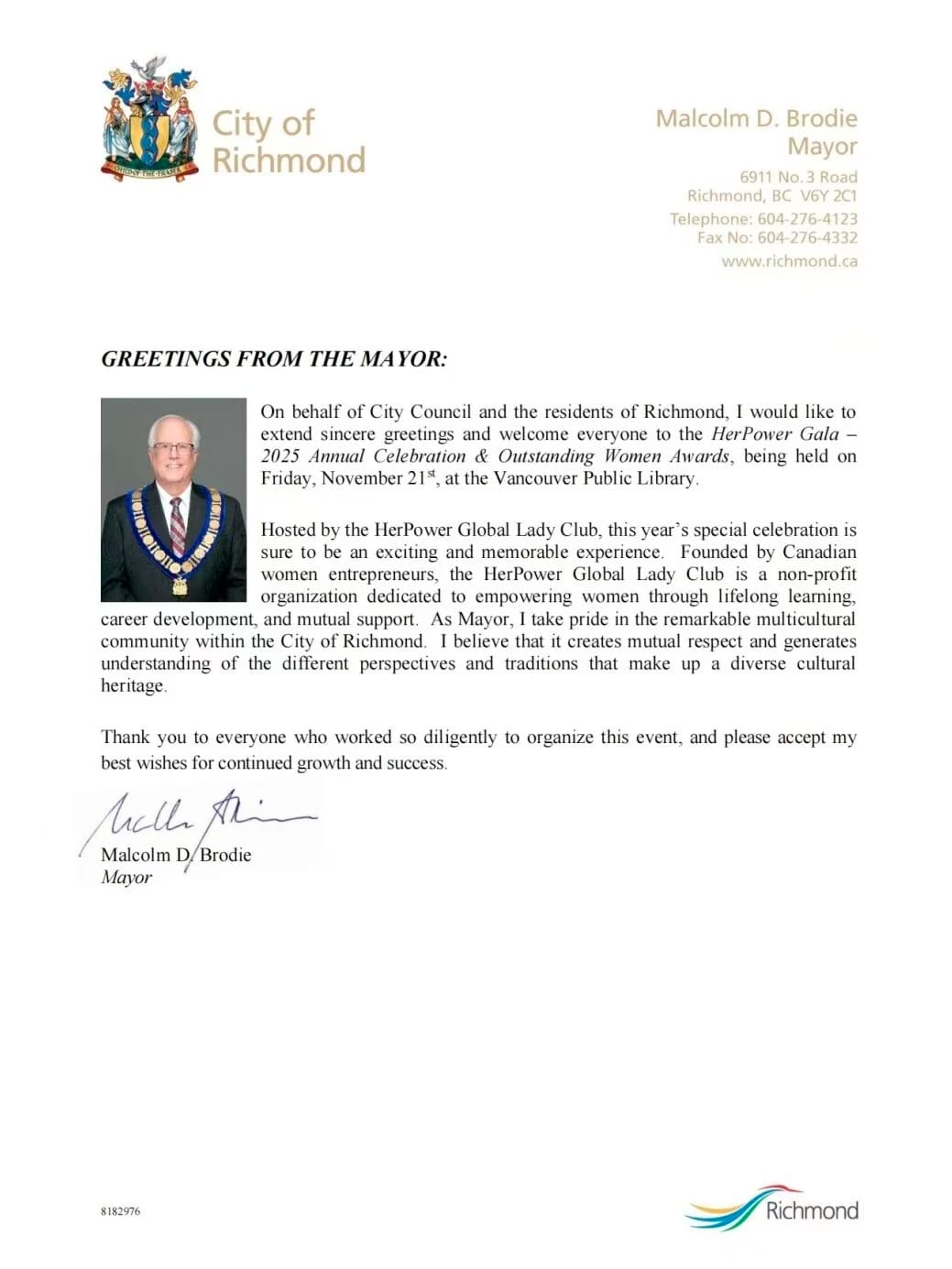 列治文市长贺信