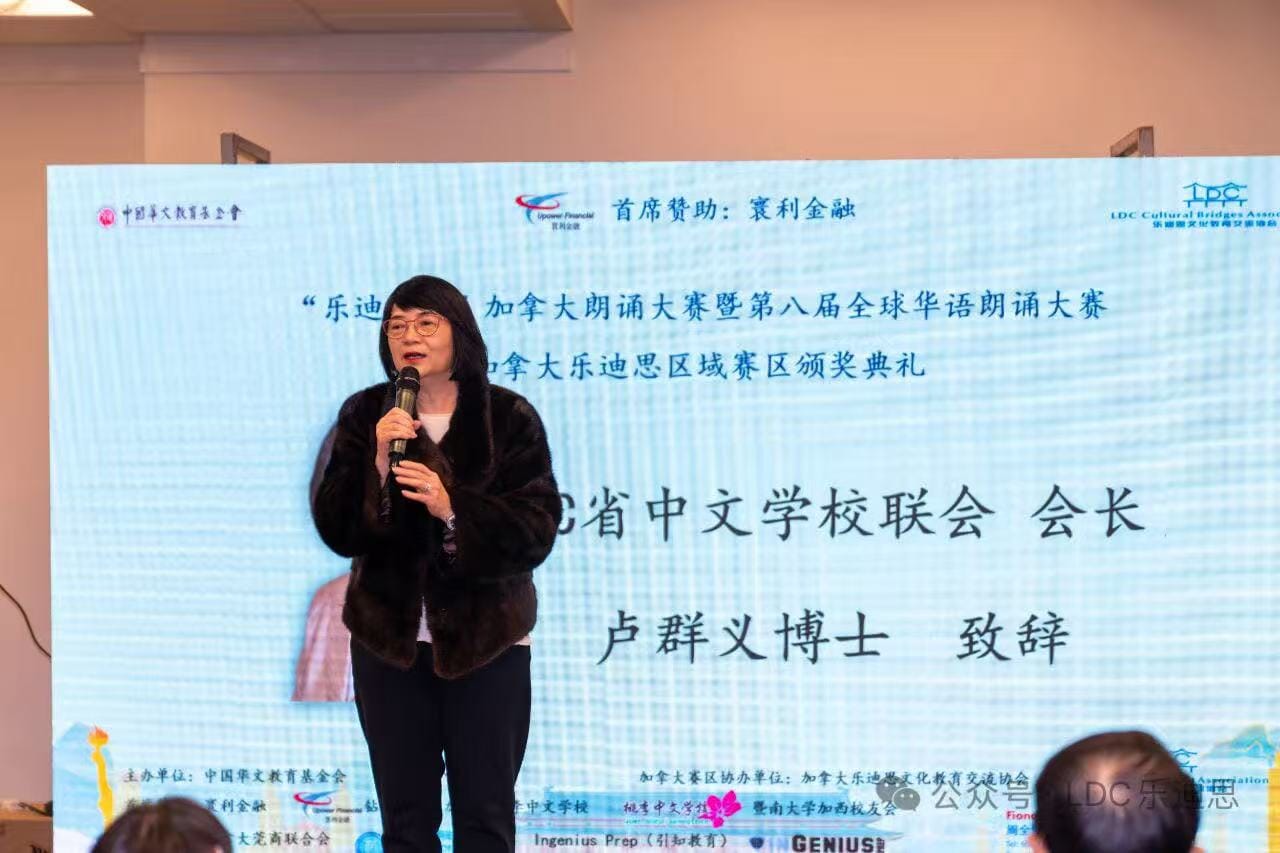 朗诵和作文两项大赛的主办方加拿大乐迪思文化交流协会的创会会长Christine Liu通过视频祝贺获奖选手并勉励他们继续努力学好中文。
