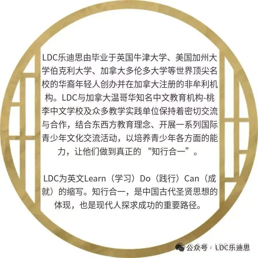 乐迪思(简称:LDC)由毕业于英国牛津大学、美国加州大学伯克利大学、加拿大多伦多大学等世界顶尖名校的华裔年轻人创办并在加拿大注册的非牟利机构。LDC与加拿大温哥华知名中文教育机构——桃李中文学校及众多教学实践单位保持着密切交流与合作,结合东西方教育理念、开展一系列国际青少年文化交流活动,以培养青少年各方面的能力,让他们做到真正的 “知行合一”。LDC为英文Learn(学习)Do(践行)Can(成就)的缩写。知行合一,是中国古代圣贤思想的体现,也是现代人探求成功的重要路径。