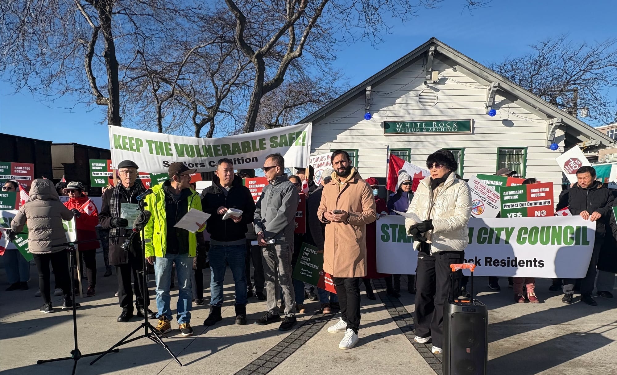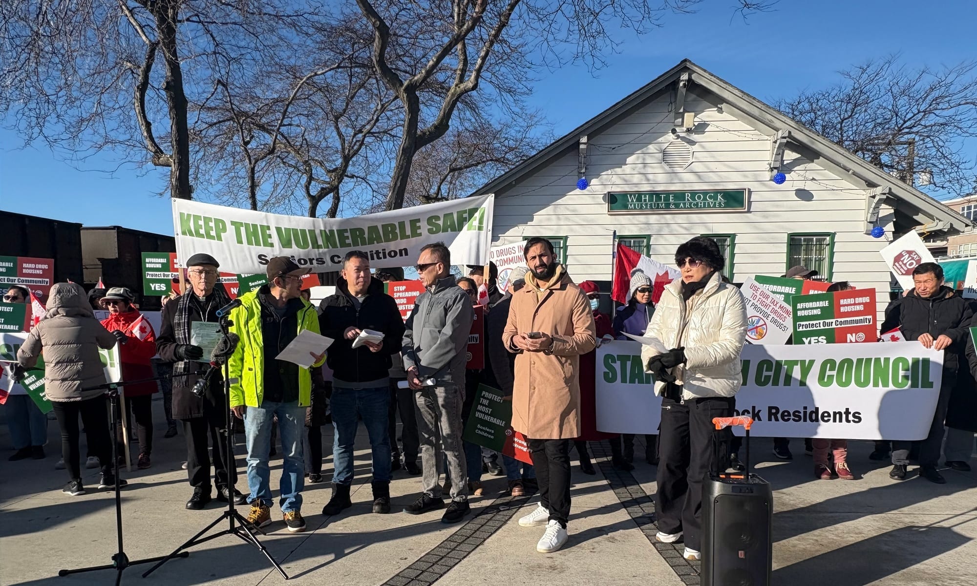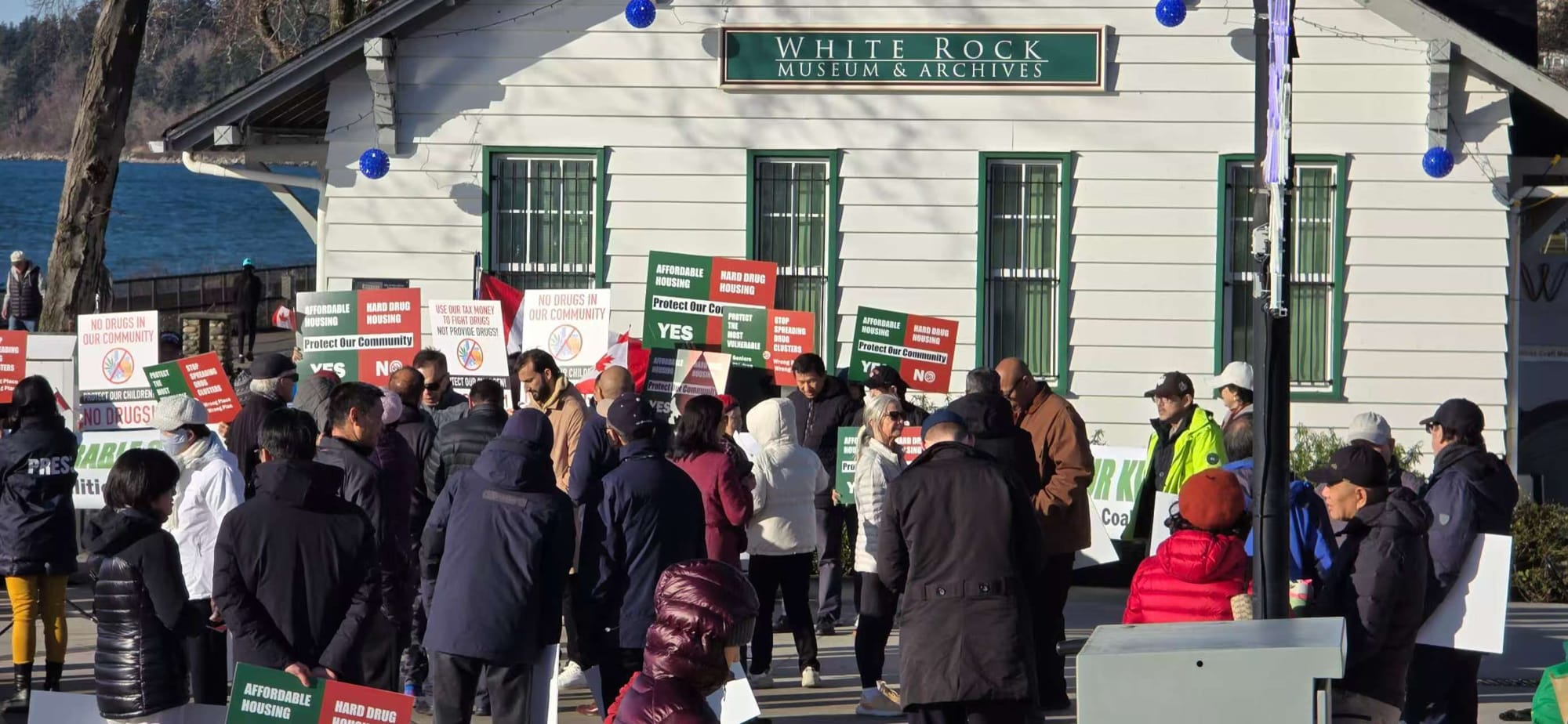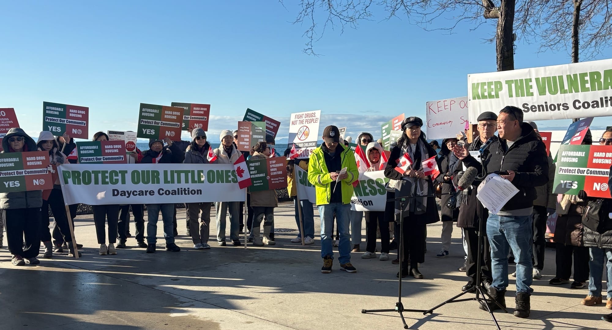 【加拿大高度传媒Lily Liu報道 】2026年1月5日上午,白石市上百居民在白石海濱長廊舉行和平示威,反對卑詩省政府強加在各城市內的「支援性房屋」(supportive housing) 项目,要求市政府從2026官方社區計畫(OCP)草案移除支援性房屋政策,並探討適合本地規模的替代方案。