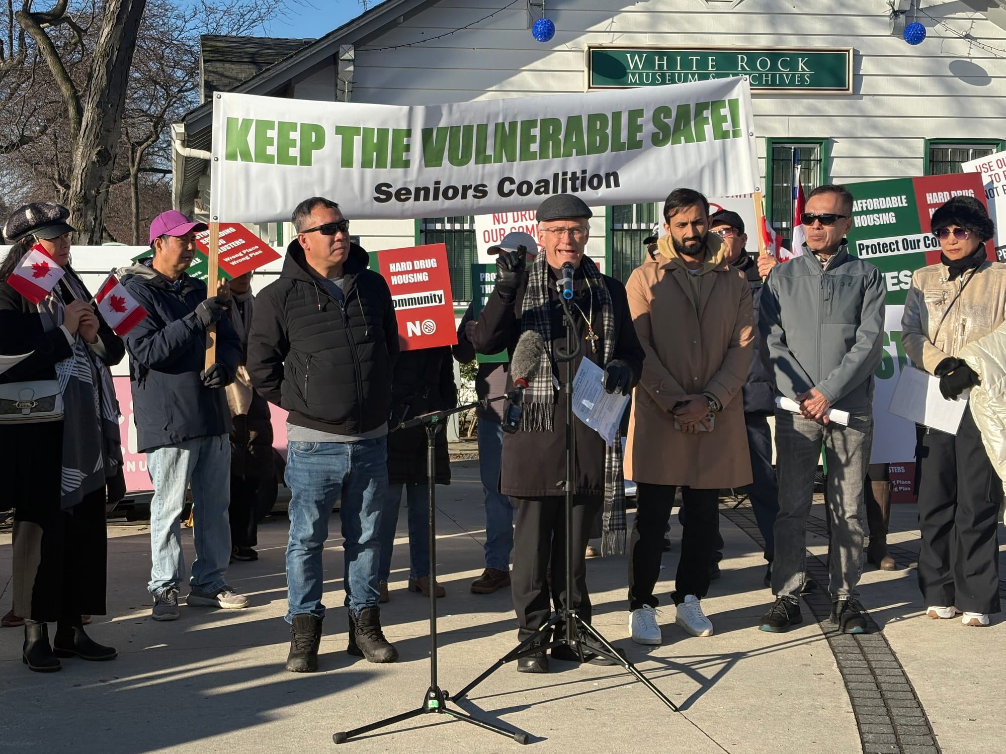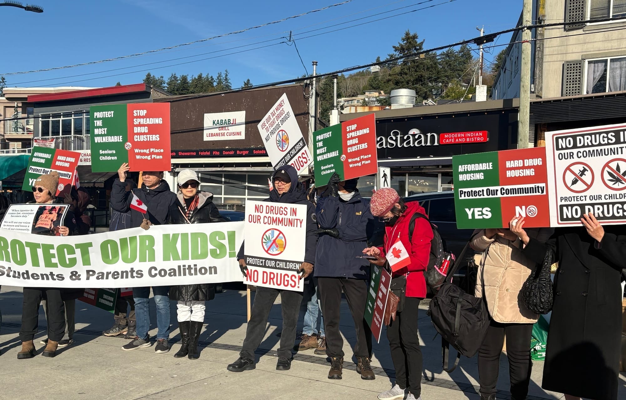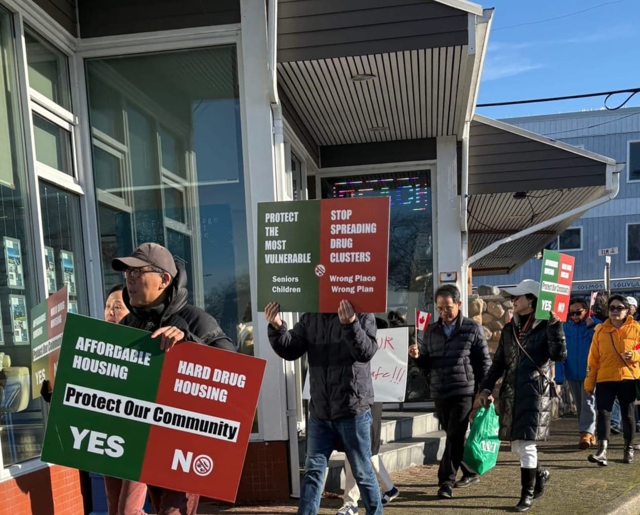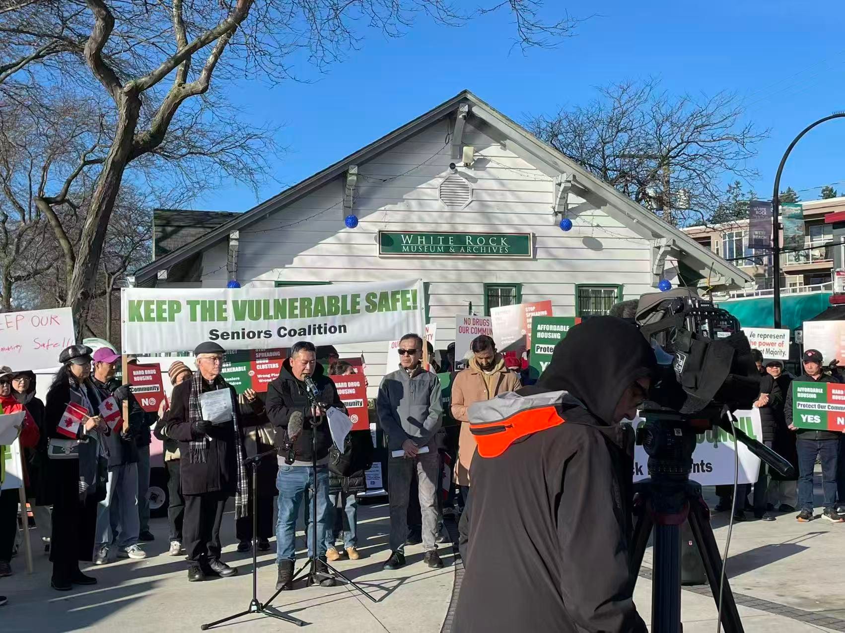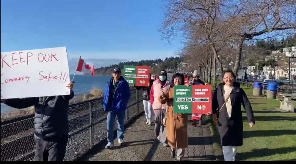 當地的三個非黨派草根組織:白石居民聯盟、WeVoteCanada.org 和保護南素里白石協會,集結了100多位當地居民和平走上街頭,他們高舉著標語並呼喊口號:「向毒品說不!」「保護社區弱勢!」「保護孩子和長者!」「不要吸毒房、要戒毒所!」--—。