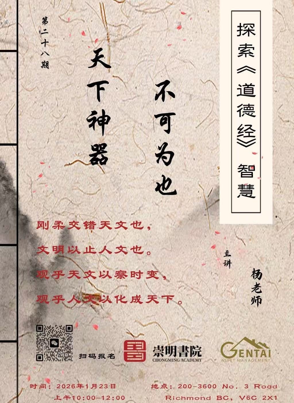 【加拿大高度传媒Lee Wu报道】2026年1月23日,周五 上午十点,在列治文景泰会所,由景泰金融和崇明书院联合举办了探索《道德经》智慧系列讲座第二十八期。