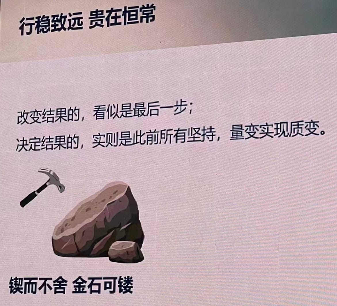 Micheal也为“火马奔腾”做出了景泰注脚:“The last stroke of the hammer breaks a stone. That doesn’t mean that the first stroke is useless.” 并进一步落到“Success is the result of continuous effort”。恰如我们常说的 “行稳致远,贵在恒常;锲而不舍,金石可镂”。 这也彰显了景泰的风控哲学:改变结果的看似是临门一脚,然而有决定意义的,其实是此前所有坚持与磨练。