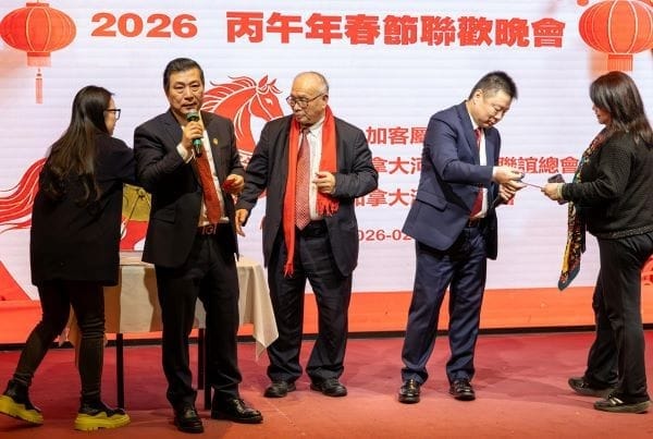 在欢迎致辞环节,全加客属联谊会会长范佐研先生表示,本次晚会象征着客属乡亲与河南同胞在海外的深度携手,是推动中华文化传承的重要实践。他指出:“客家文化承载着迁徙与坚守的历史记忆,中原文明则是中华民族的重要源头。今天我们在加拿大相聚,不只是庆祝春节,更是在用文化连接过去与未来,连接家乡与世界。”加拿大河南同乡联谊总会暨总商会副理事长王向东先生在致辞中强调,河南作为华夏文明的重要发源地,与客家文化有着深厚历史渊源。他表示:“客家与河南血脉相连,同根同源,两大社团的首次合作,是海外华人团结协作的新起点。我们希望通过这样的文化盛会,让下一代在多元社会中依然认识自己的根与魂。” 全加客属联谊会永远荣誉会长朱展伦先生与加拿大河南同乡联谊总会暨总商会顾问付明安先生也分别发言,感谢社会各界长期以来对华人社区的支持,并呼吁侨界继续携手推动文化交流与社区发展。主办方代表一致表示,将继续携手打造具有影响力的品牌文化活动,促进华人社区的团结与发展,推动中华文化在加拿大薪火相传。