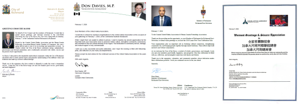 卑诗省省议员屈洁冰女士因其他公务不能久留,但还是亲自到场送来贺函送上祝愿。送来贺信贺函的还有:加拿大联邦国会议员Don Davis, 列治文市长马保定先生,加拿大文化部长Marc Miller先生,加拿大联邦国会议员白恩斯先生。