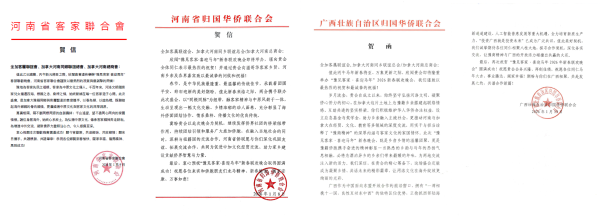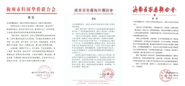 本次春晚,还收到来自祖国的贺信贺函,家乡的亲人们记挂着侨居海外的兄弟姐妹,远隔重洋发来了新春的良好祝愿。他们是: 河南省归国华侨联合会 , 河南客家联合会,广西壮族自治区归国华侨联合会,江西赣州归国华侨联合会,江西赣州客家联合会,福建闽西客家联合会,广东梅州归国华侨联合会,广东省客属海外联谊会,海南省客属联谊会。两会携手联办此次盛会,以“同根同脉”为纽带,融客家精神与中原风韵于一体,生动呈现出一幅文化交融、乡情浓郁的动人画卷,充分彰显了海外侨团团结协作、情系桑梓、传播文化的优良传统。