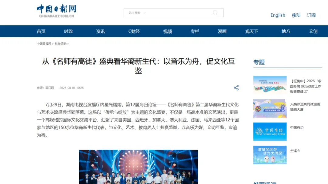 2025年7 月 29 日晚,第 12 届海归论坛:《名师有高徒》第二届华裔新生代文化与艺术交流盛典,在湖南广播电视台演播厅华彩启幕。揭幕了《名师有高徒》第三届全球试音见面会的启动仪式。