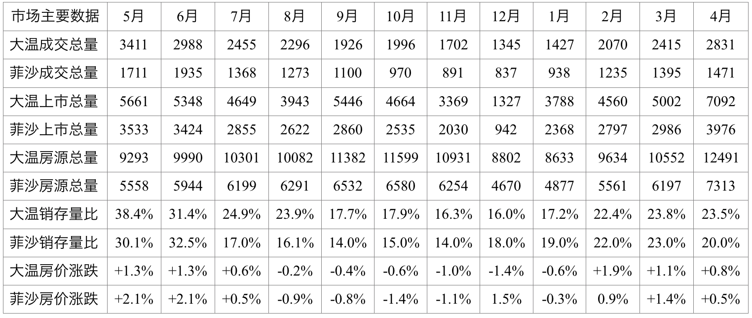 例如,刚刚过去的4月份,房屋的上市量,较3月份大幅增加了41.8%,使得市场上的总体房源达到了12,491套,超越了过去10年来相同季节平均值的16.7%,比去年同期大幅增加了64.7%,这就是一个明证,供求关系开始偏移,对市场房价的上升,会起到抑制作用。