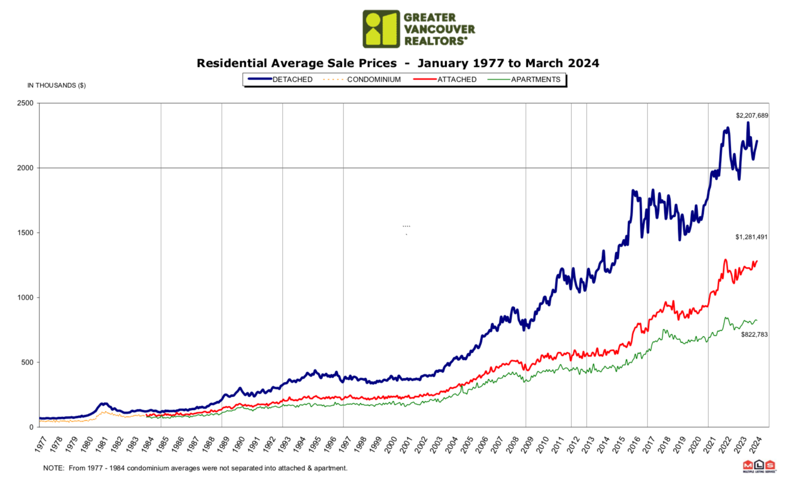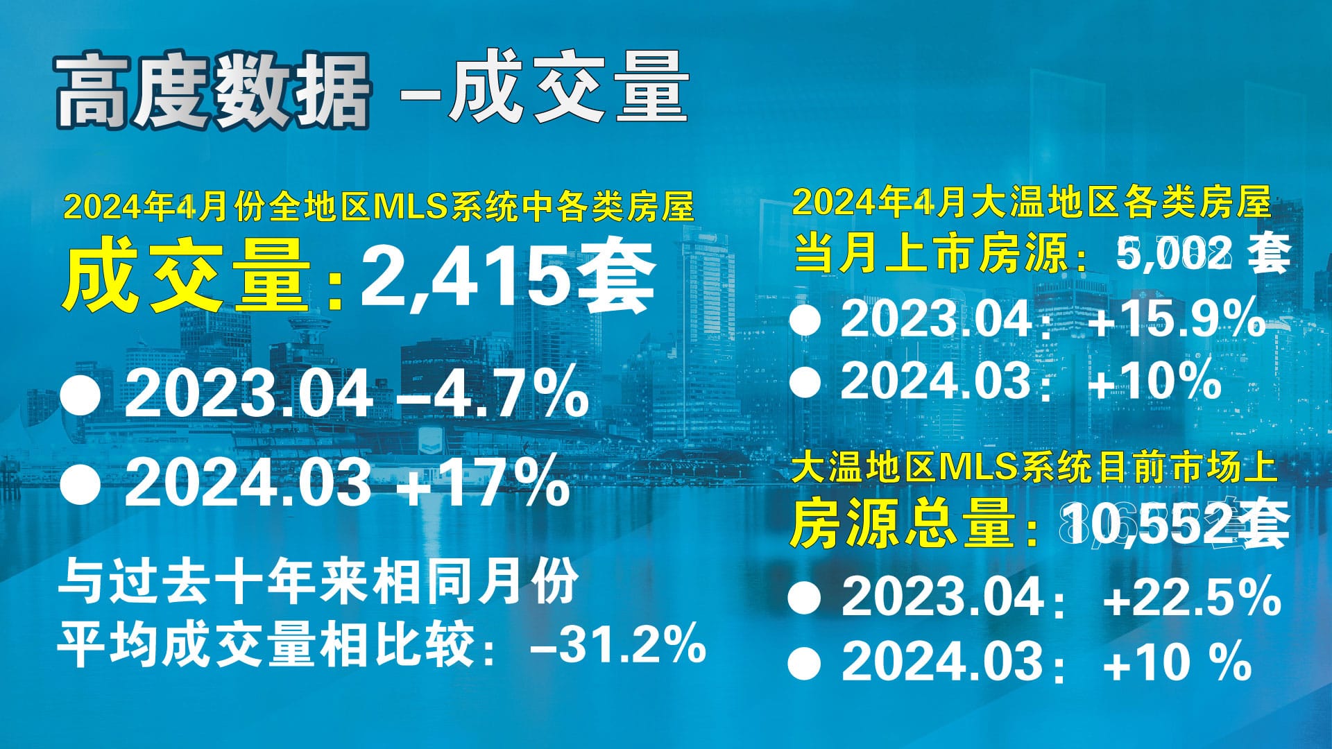 在成交量方面,温哥华地区房地产协会的数据报告显示,2024年4月份全地区MLS系统中各类房屋的交易总量为2,381套,与2023年4月份相比增加了3.3%,与2024年3月份相比增加了17.2%。上个月的总成交量与过去十年来相同时段成交量的平均值相比,减少了12.2%。 2024年4月大温地区各类房屋的当月上市房源为7,092套,与2023年4月相比增加了64.7%,比2024年3月份增加了41.8%。大温地区MLS系统目前市场上的房源总量为12,491套,比2023年4月增加了42.1%,与2024年3月份相比增加了18.4%。目前的房源总量与过去十年来相同时段房源总量的平均值相比,增加了25.8%。