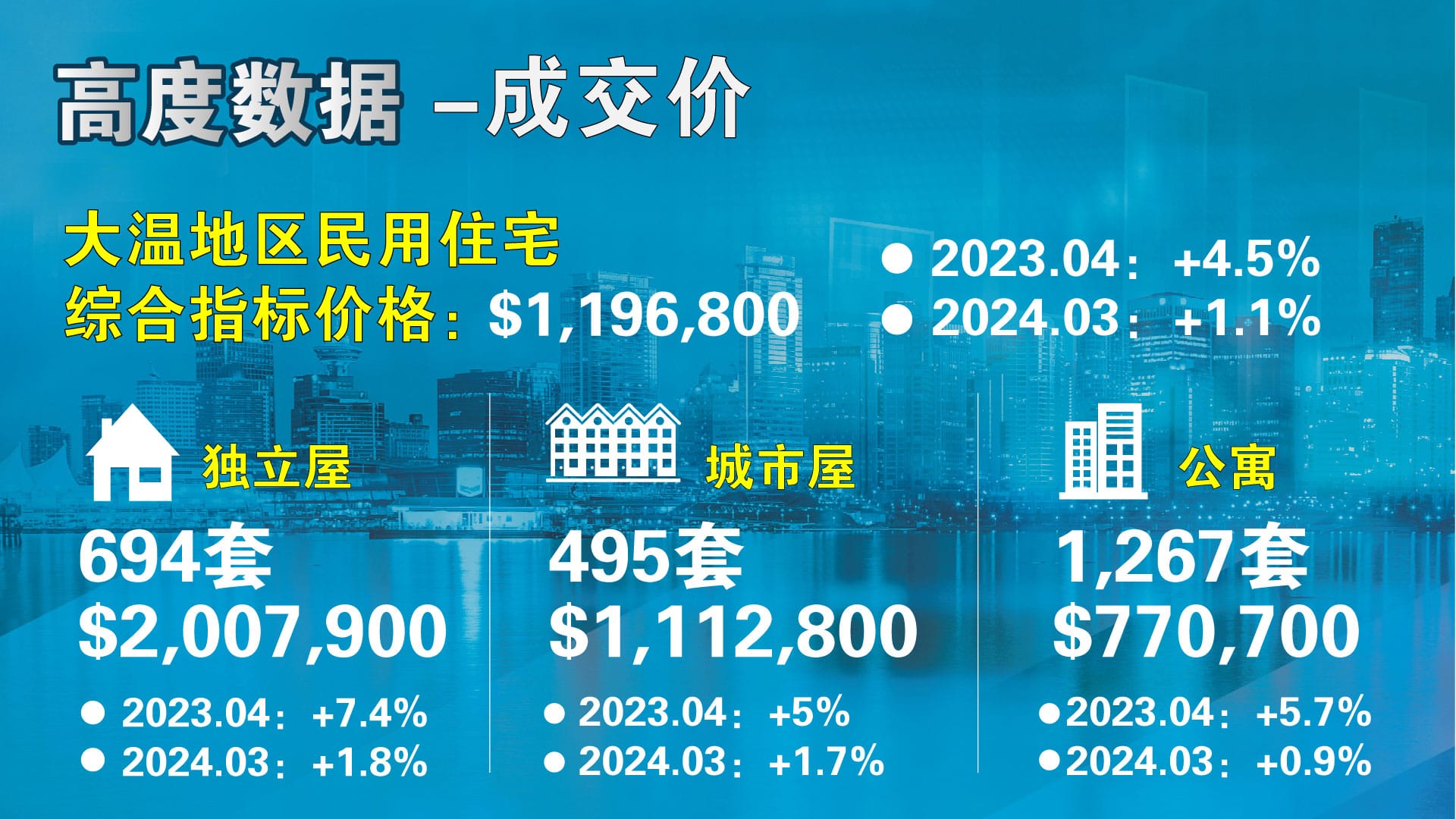 在成交价方面,大温地区民用住宅MLS房屋价格指数的综合指标价格现在是$1,205,800,比去年同期上涨了2.8%,与上个月相比价格上涨了0.8%。在各类房型中,目前全地区独立屋的指标价格为$2,040,000,比去年同期上涨了6.3%,过去一个月上涨了1.6%;公寓的指标价格为$776,500,比去年同期上涨了3.2%,过去1个月来价格下跌了0.1%;目前全地区城市屋的指标价格为$1,127,200,比去年同期上涨了4.3%,比上个月上涨了1.3%。