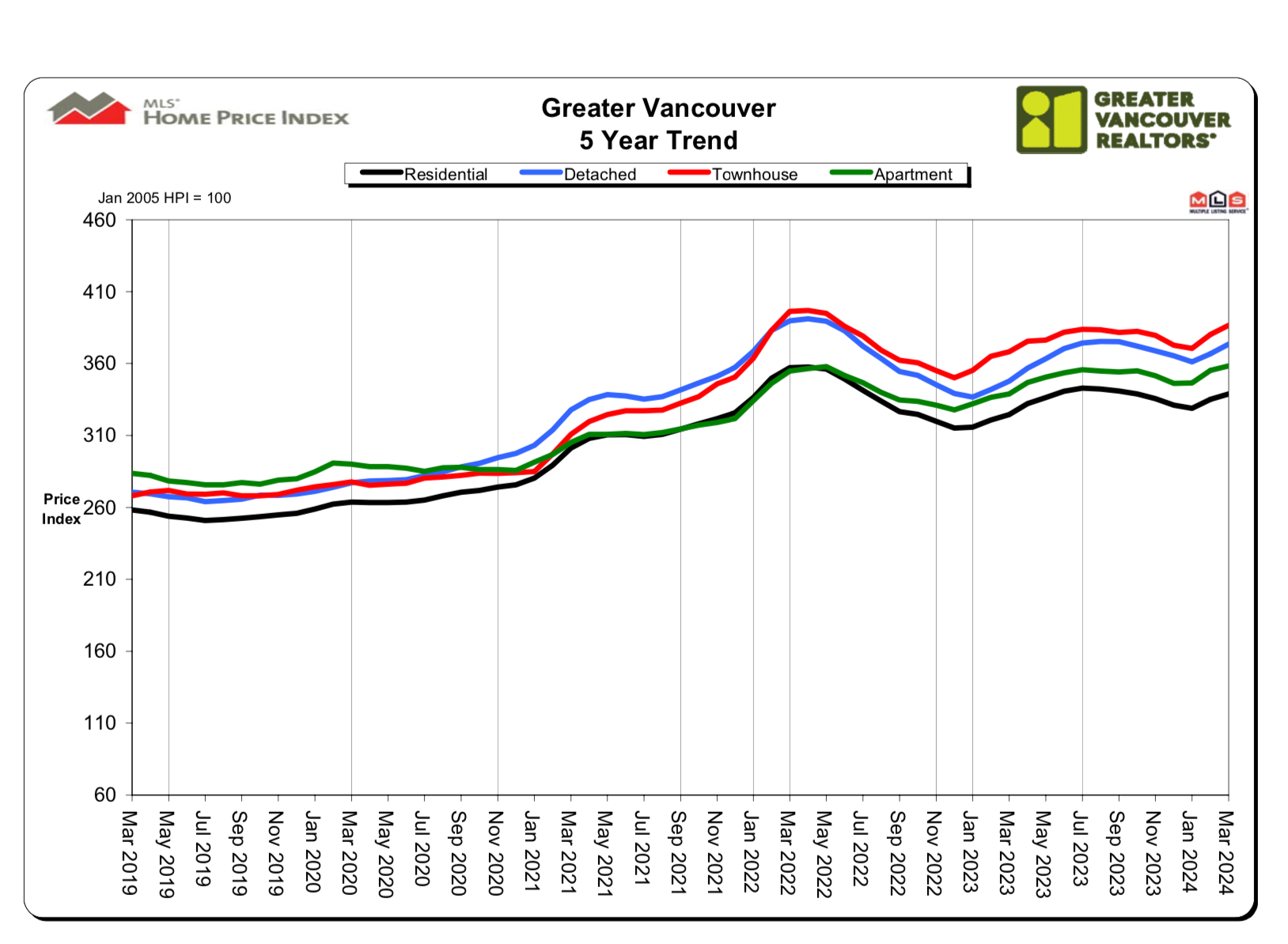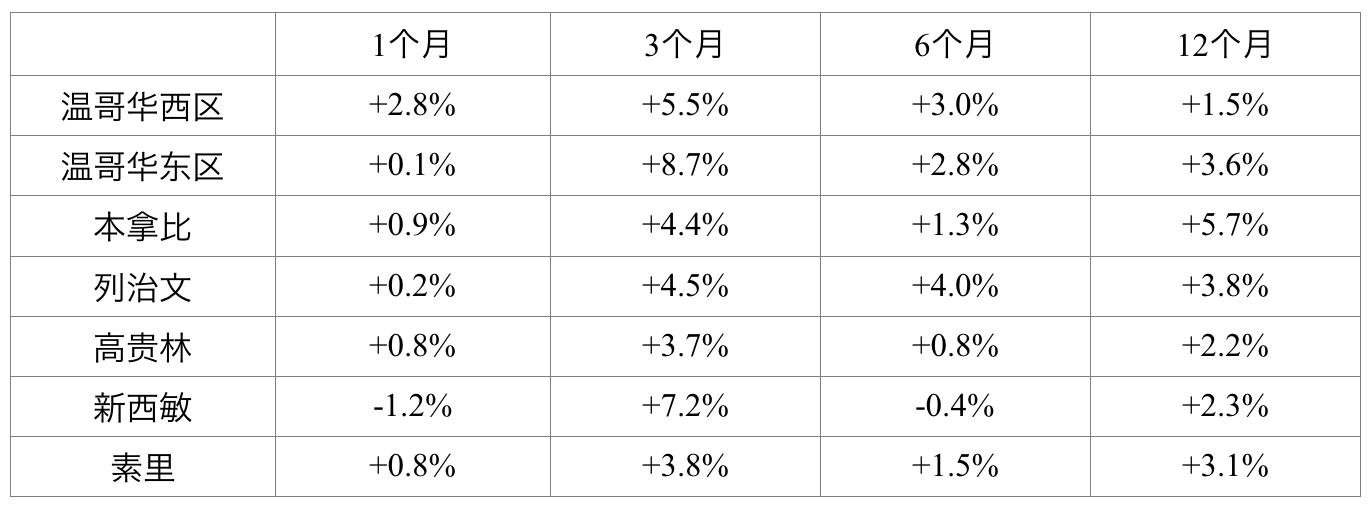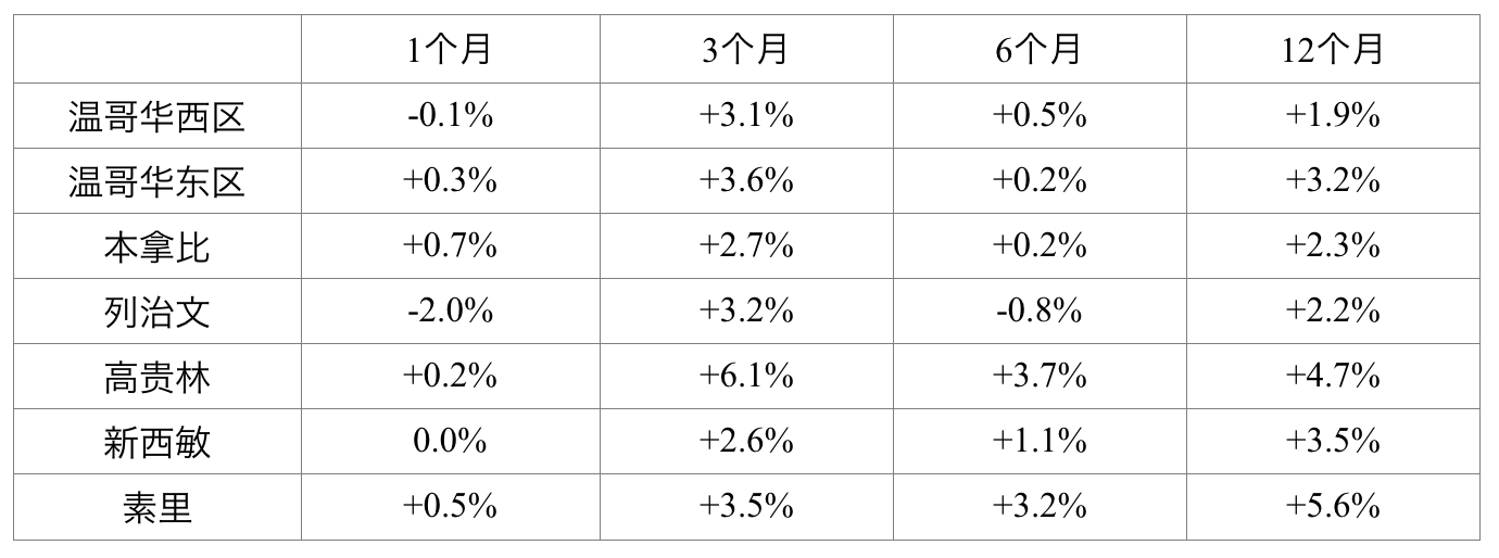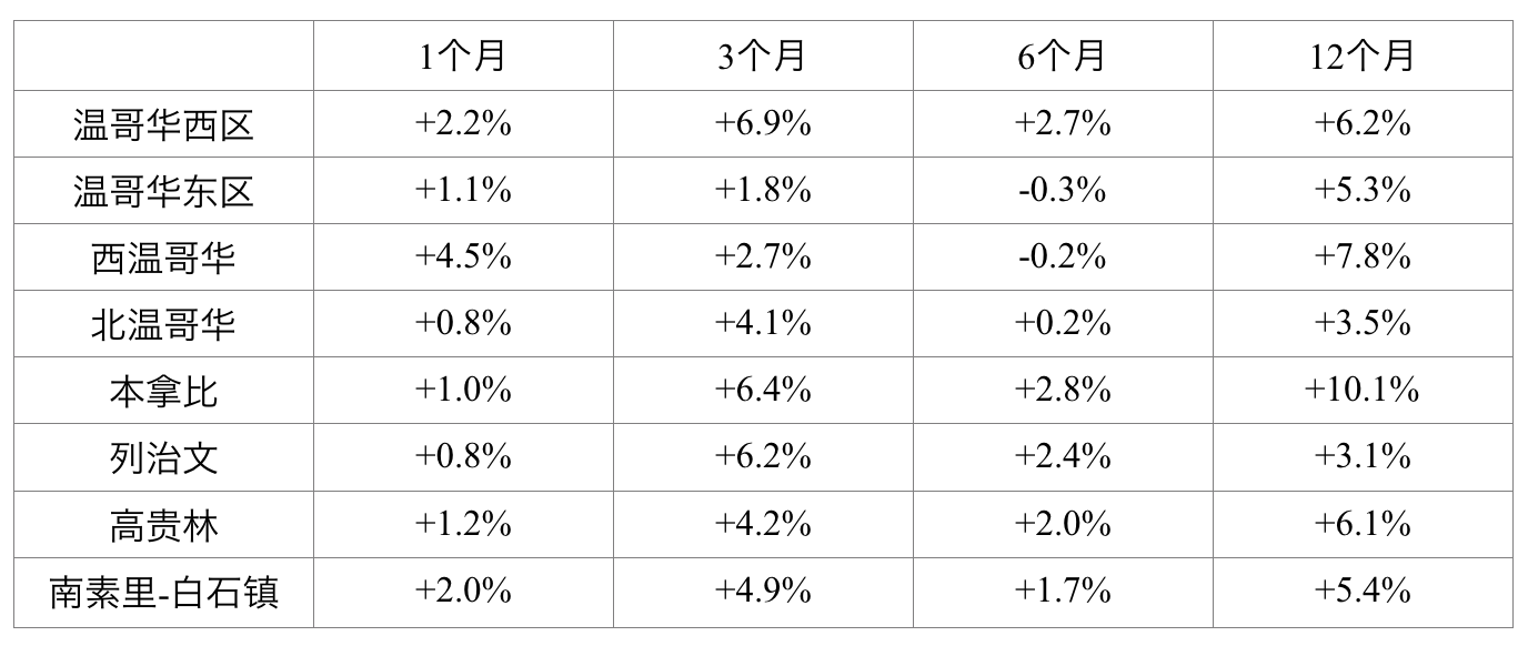 请看下列图表,观察过去12个月内温哥华地区各类指标价格的逐月变化: