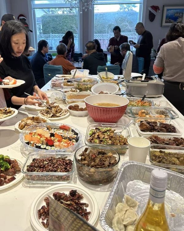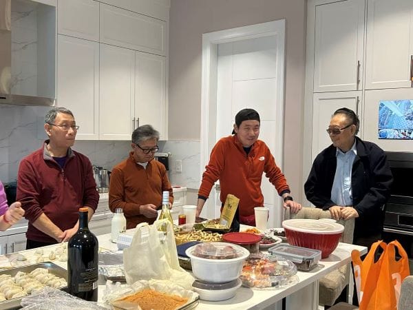 聚会是Potluck 百家宴,南北风味荟萃,当然更少不了饺子。饺子作为团圆的象征,承载着深厚的情感价值。大家欢聚一堂的时刻,包饺子、煮饺子、共享吃饺子的过程,不仅增进了校友间的感情,更传递着爱与温暖。下午3时许,校友们便陆陆续续来到副会长江传瑜家,老会长秦晓梅,校友郑炳玉带着她们早准备好的面,和好的三鲜饺子馅,几位校友一起动手,几百个饺子很快包完。
