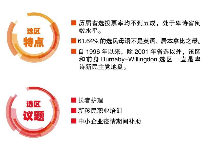 卑诗绿党候选人则为温哥华市府前公务员Norine Shim,Norine Shim来自韩裔社区,早年曾在亚洲多国工作,2012年返回加拿大,在本拿比定居,并在温哥华市府谋求到一份财务部门公务员的职务。工作之余Norine Shim一直参与社区活动,同时也是绿党活跃分子,主张建立一个更加公平,更加包容和对自然生态环境更友好的社区。就绿党选情而言,区内生态环境保护以及可负担住房议题依旧有能够发挥的空间,上届省选绿党之所以在本区得票率突破一成大关,就得益于上述两个议题的发酵。而Norine Shim的公务员背景使她更了解公共议题以及如何同政府打交道,这些都有利于她争取潜在选民支持。