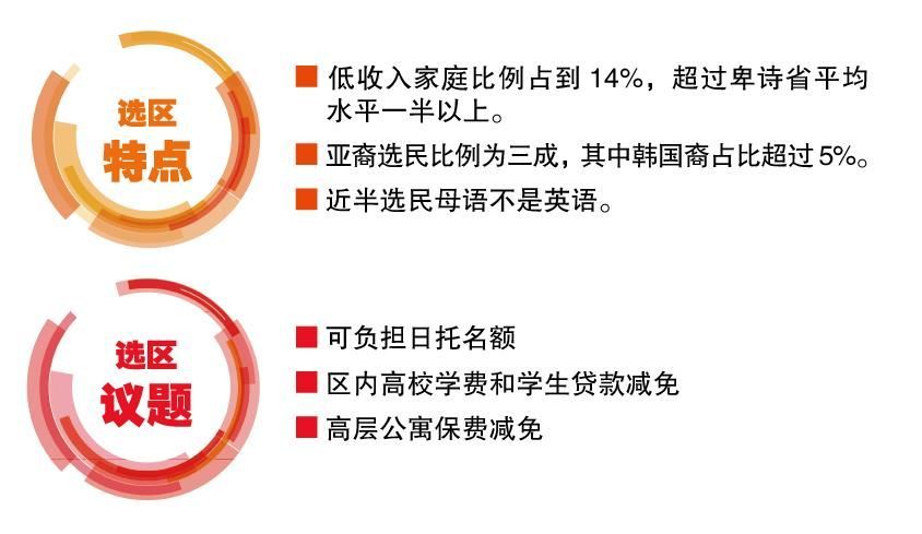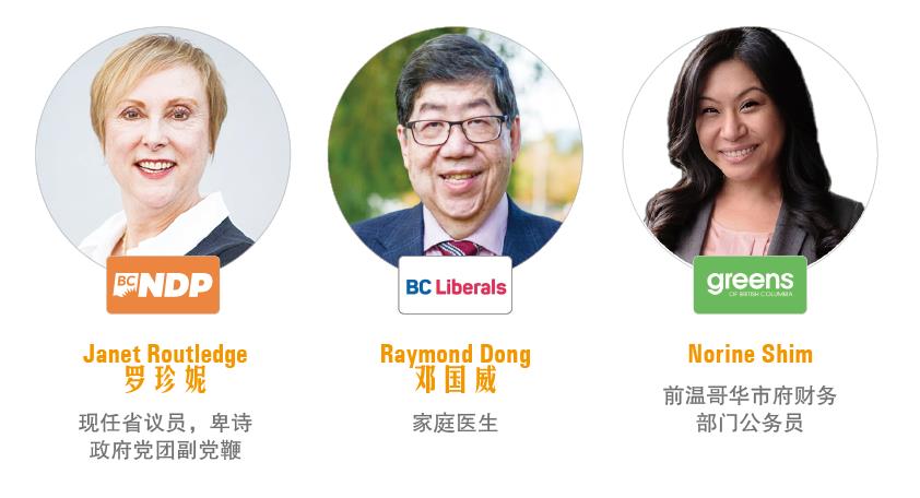 卑诗新民主党候选人为现任省议员罗珍妮,她作为资深工会活动人士,曾在加拿大公共服务联盟工作了三十多年,期间曾代表联盟与联邦政府谈判,为工人争取更好的工作环境,更完善的福利待遇和男女同工同酬。另外罗珍妮还是女性健康公益组织Everywoman’s Health Centre董事会成员之一,致力于为女性生殖健康进行科普和援助。2017年当选以后,罗珍妮还兼任卑诗政府党团副党鞭,为本选区诸如社区中心翻新争取到拨款,此外她的儿媳是华人,因此也得到了少数族裔社区支持,连任优势很大。