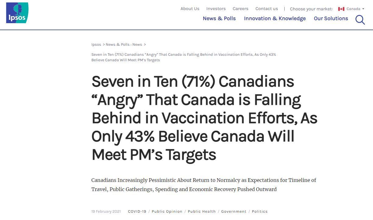 爱索普(Ipsos)的民调显示,71%的加拿大人对于加拿大疫苗接种进度远远落后于美、英等国感到愤怒。只有43%的人认为加拿大能在9月底完成全民接种,而美国和英国预计在6月底就能完成疫苗接种。