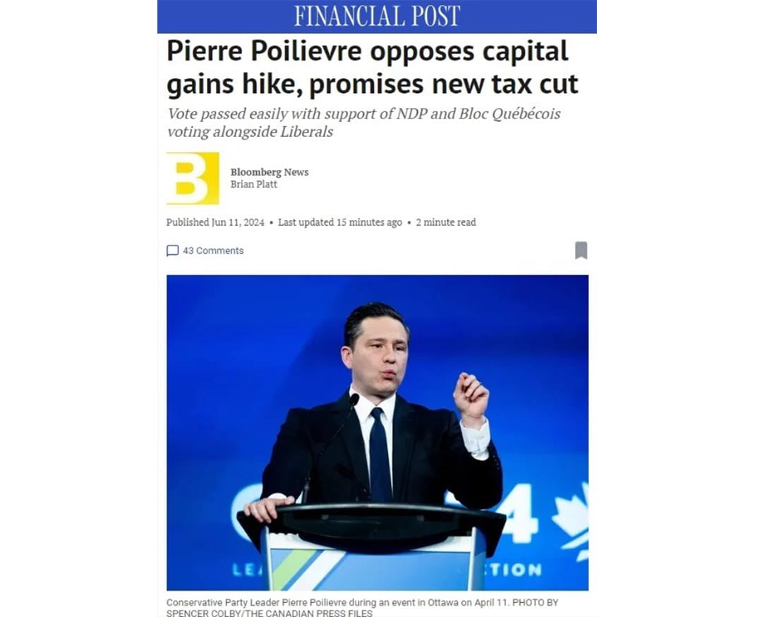 6月11日,保守党党领博励治(Pierre Poilievre)宣布,他将投票反对自由党政府提高资本利得税(capital gain tax)的提议。不过,在新民主党和魁北克政党的支持下,该提案仍然以208票对118票的表决结果获得通过。