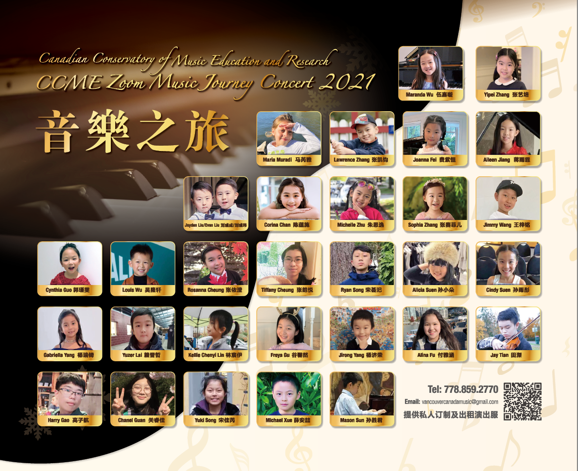 Initiated by Hebe Ma, who is a Grade 12 student in Pinetree Secondary School, Canadian Conservatory of Music Education & Research (CCME) organized a charity piano concert -- “2021 Music Journey” which was held on January 6, 2021. Not as before, this concert was migrated to Zoom due to the coronavirus pandemic. Mrs. Linda Li, Piano Product Manager at Tom Lee Music and Mr. Lawrence Wu, the young artist parent representative were invited to be the hosts of the concert. In the meanwhile, Ron McKinnon, Member of Parliament, Coquitlam-Port Coquitlam Office, Kristina Murray, Eagle Ridge Hospital Foundation Staff, Tom Lee Music Vice President Graham Blank and Mrs. Iris Fan, General Manager at Tom Lee Music and Executive Director of The Steinway Young Artists Club also made speech and sent congratulations to the concert. Over 30 young artists led audience into a fascinating music world by their wonderful performance.