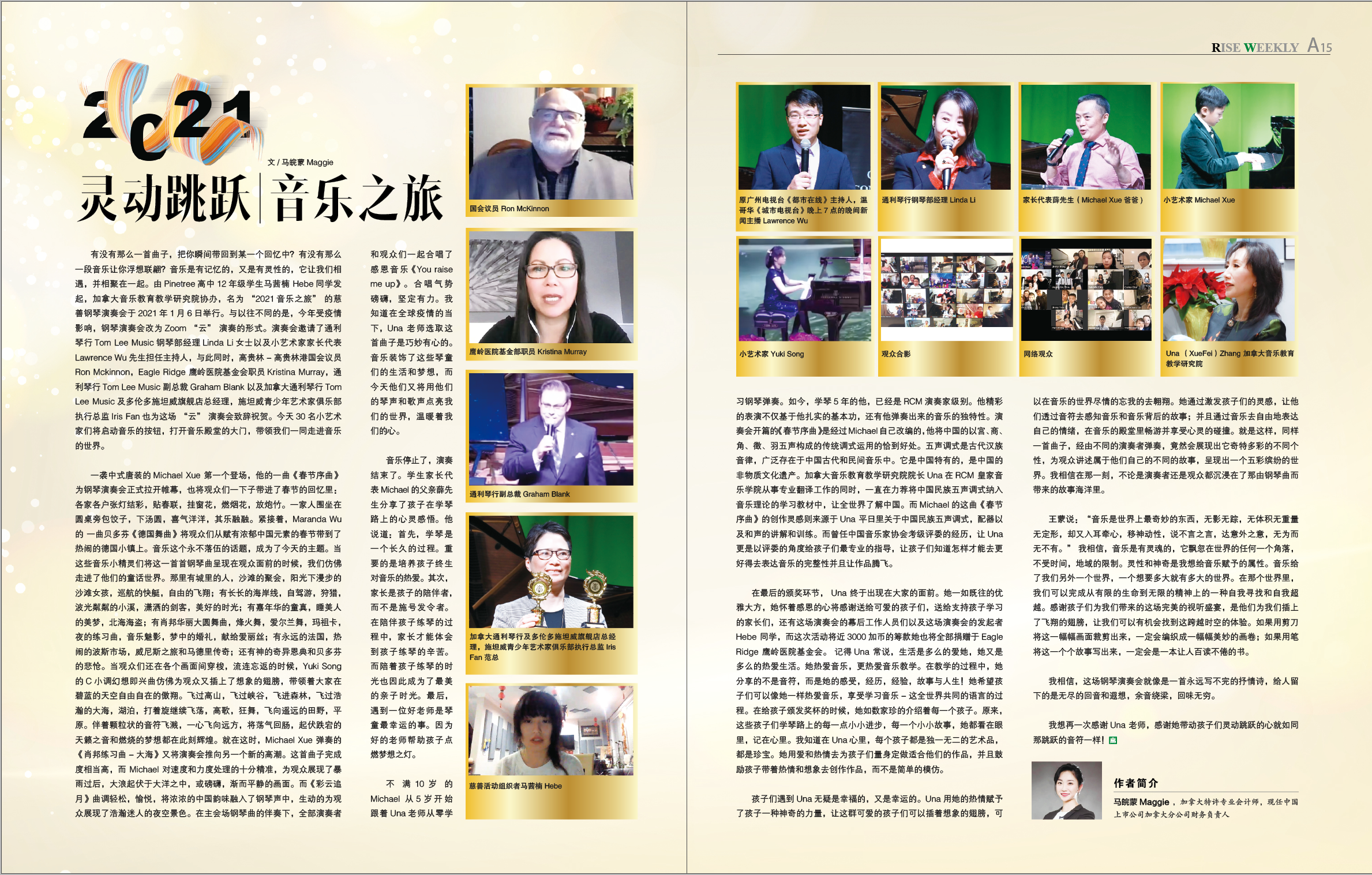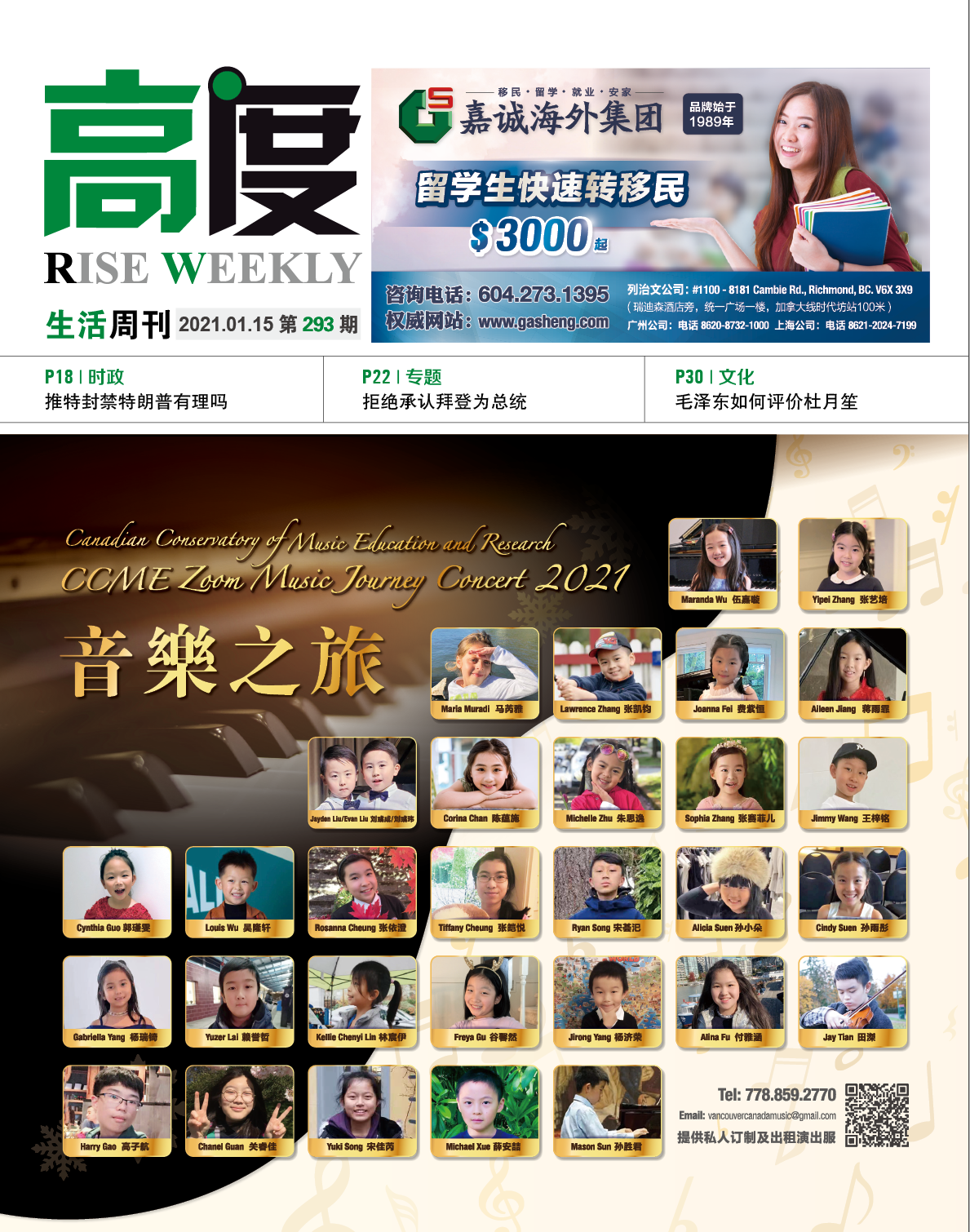 有没有那么一首曲子,把你瞬间带回到某一个回忆中?有没有那么一段音乐让你浮想联翩?音乐是有记忆的,又是有灵性的,它让我们相遇,并相聚在一起。由Pinetree高中12年级学生马茜楠 Hebe同学发起,加拿大音乐教育教学研究院协办,名为 “2021音乐之旅” 的慈善钢琴演奏会于2021年1月6日举行。与以往不同的是,今年受疫情影响,钢琴演奏会改为Zoom “云” 演奏的形式。