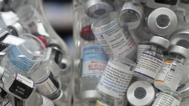 2022 年 4 月 6 日星期三,多伦多 COVID-19 疫情期间,Junction Chemist 药房里摆满了装满空的 COVID-19 疫苗小瓶的罐子。根据加拿大媒体收到的数据,加拿大至少有 1900 万剂 COVID-19 疫苗将于今年年底到期。(加拿大媒体/Nathan Denette)