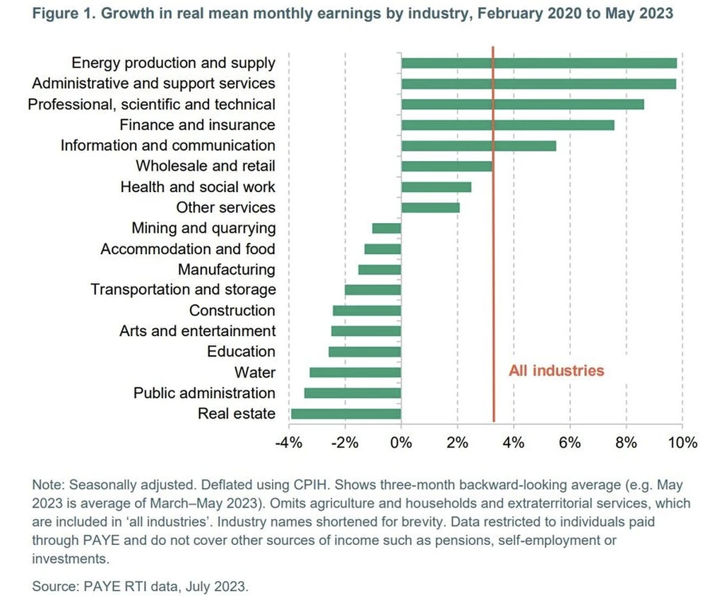 那中产阶级呢?据IFS(财政研究所)研究,收入在中间的人仅增长了1.7%,达到每月2700英镑。IFS高级研究员在一份报告中表示:“伦敦的高收入者早已跳出了通货膨胀的影响,而中收入者几乎没有任何工资增长,这加剧了贫富差距。”