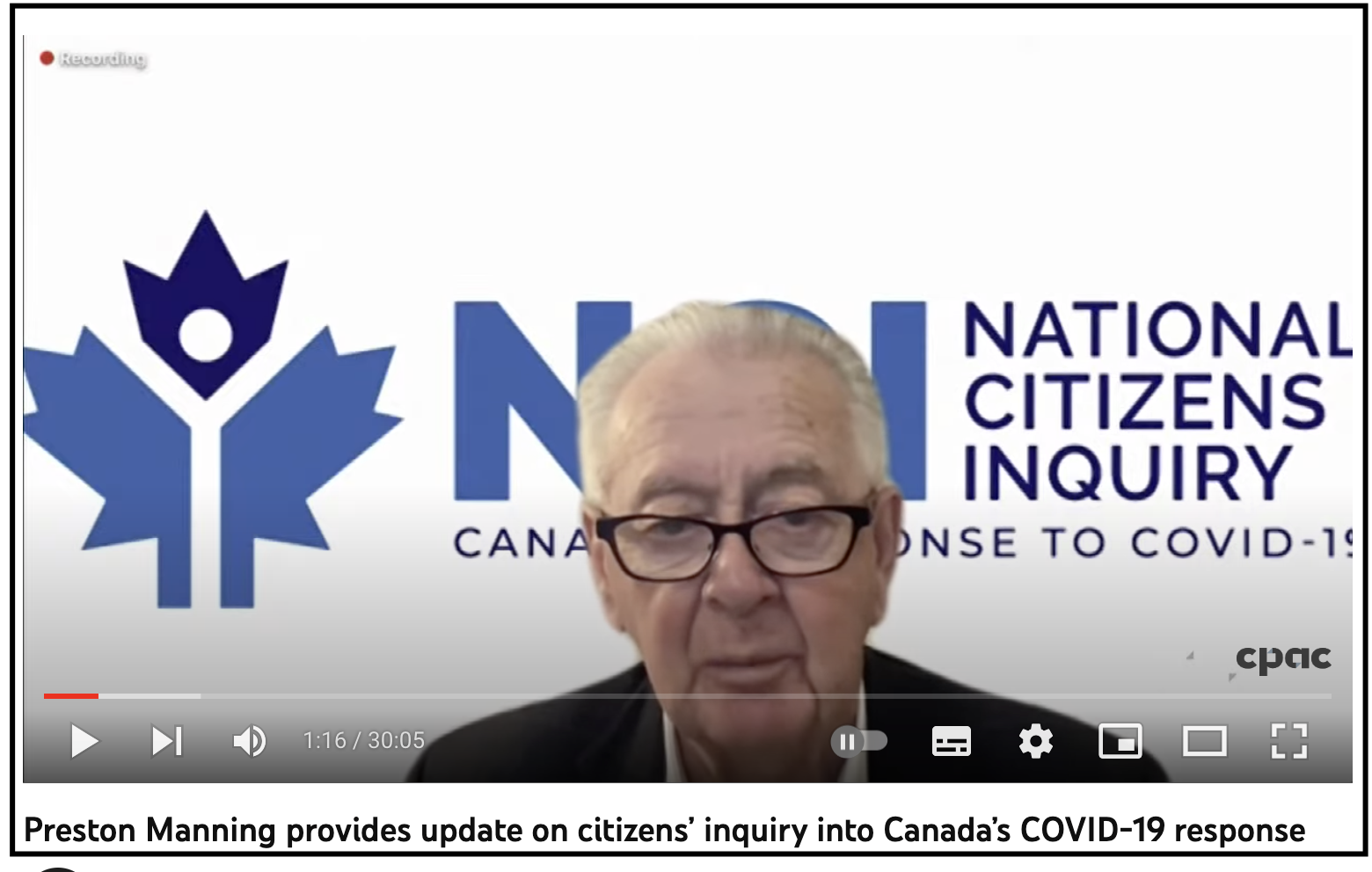 2022 年 12 月 20 日,前改革党领导人普雷斯顿·曼宁 (Preston Manning) 介绍了公民独立调查的最新情况,该调查旨在调查对加拿大各级政府在COVID-19 期间行为的反馈。 (截图自 Youtube)